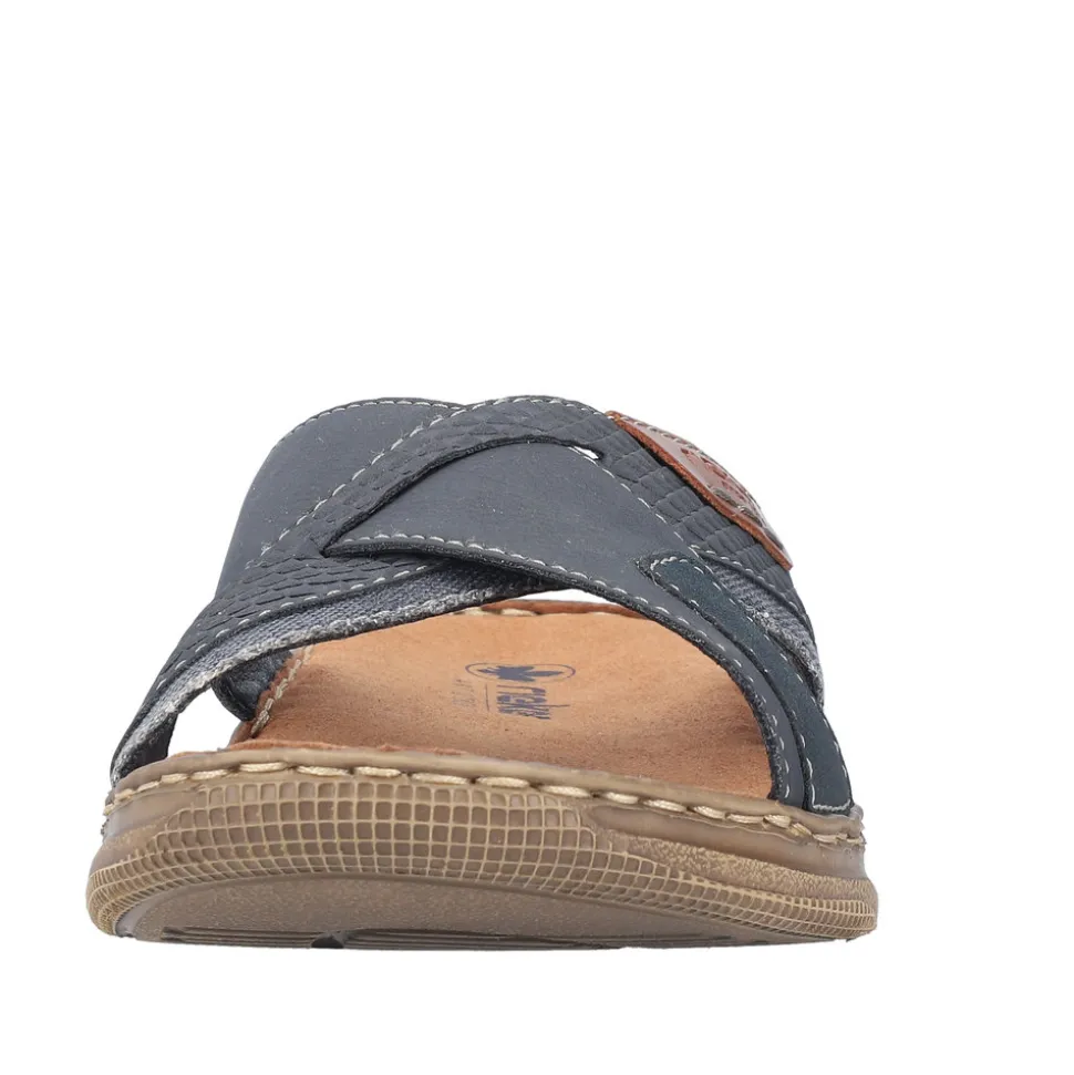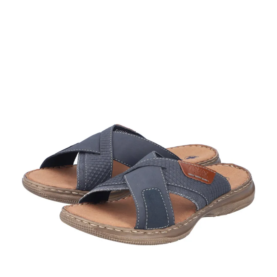 Rieker sandal til herre i blå. Perfekt til sommeren! Disse skiferblå Rieker herresandaler overbeviser med moderne design og høj komfort. Sandalen har ingen lukning og kan derfor tages på i en håndevending. Den åbne sandal samt den ultralette og fleksible sål sikrer vedvarende velvære. Et andet plus er den ekstra bløde dæksål. Den komfortable bredde G 1/2 giver tæerne tilstrækkelig bevægelsesfrihed. Sandalen er udstyret med et let, åndbart foer, der også absorberer fugt og dermed sikrer godt til sværtende fødder. Så afsted med dig!