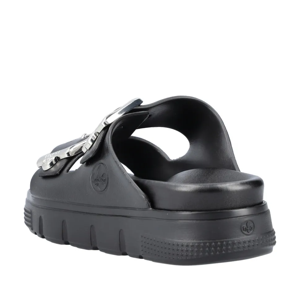 Rieker sandal i sort til dame. Oplev ægte sommerkomfort med disse stilfulde Rieker slenters til damer. Fremstillet i glanssort plast, giver de dine fødder en frisk og luftig følelse. Sandalen lukkes nemt med en elegant justerbar sølvspænde, og den åbne design sammen med den ultra lette og fleksible sål sikrer, at dine fødder forbliver behagelige hele dagen. Perfekte til enhver sommeraktivitet – gå ikke glip af dem!