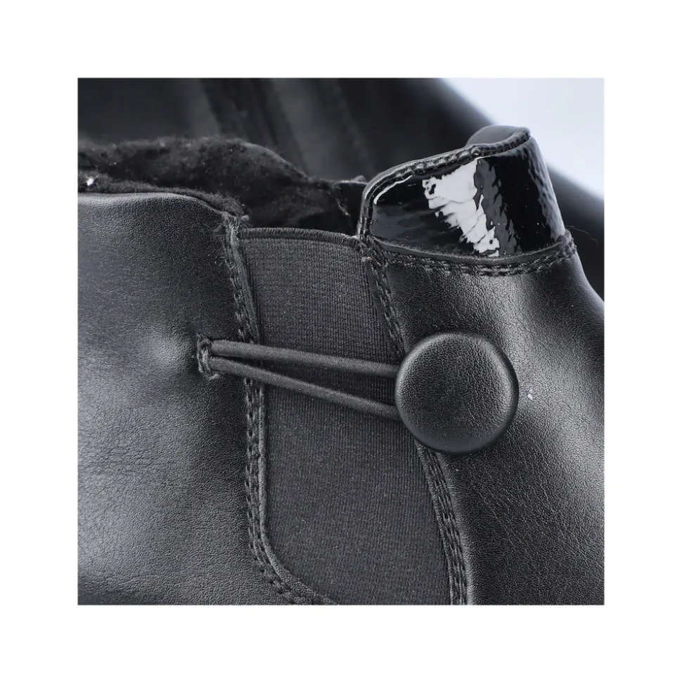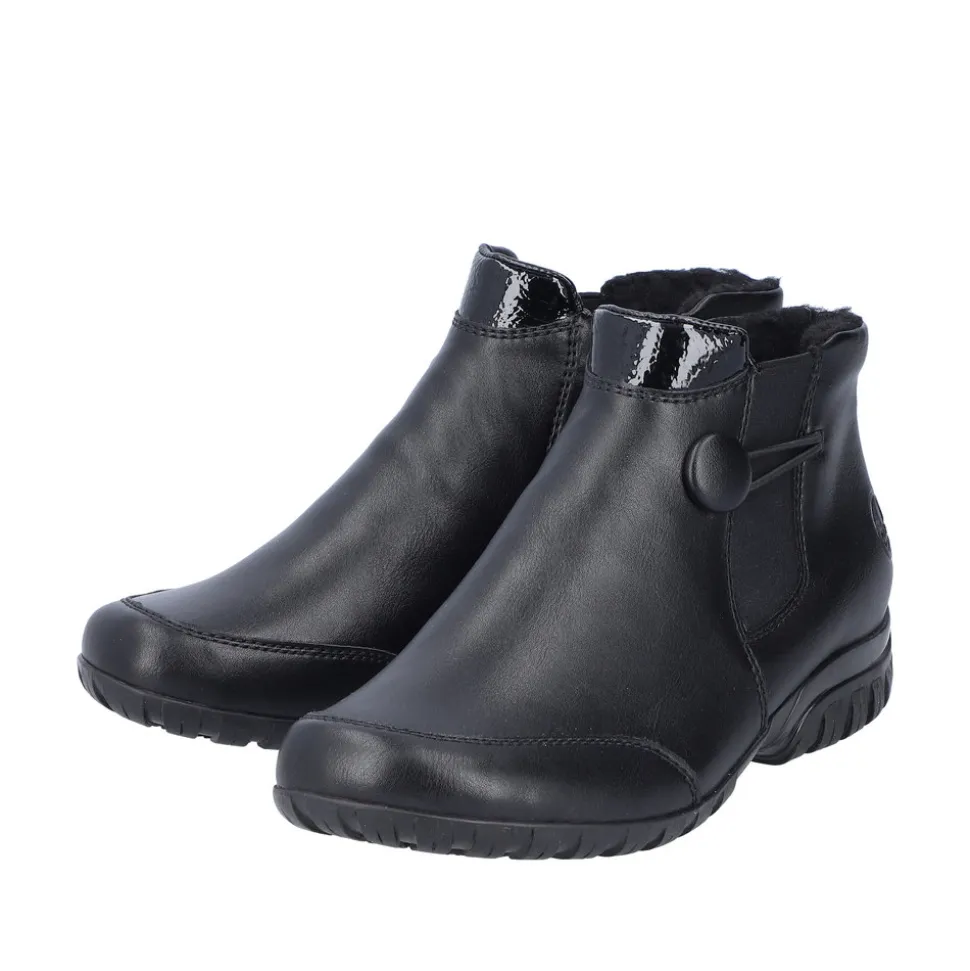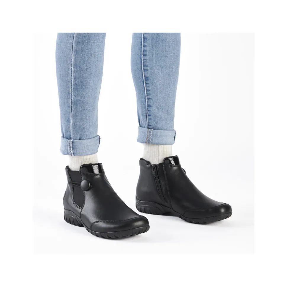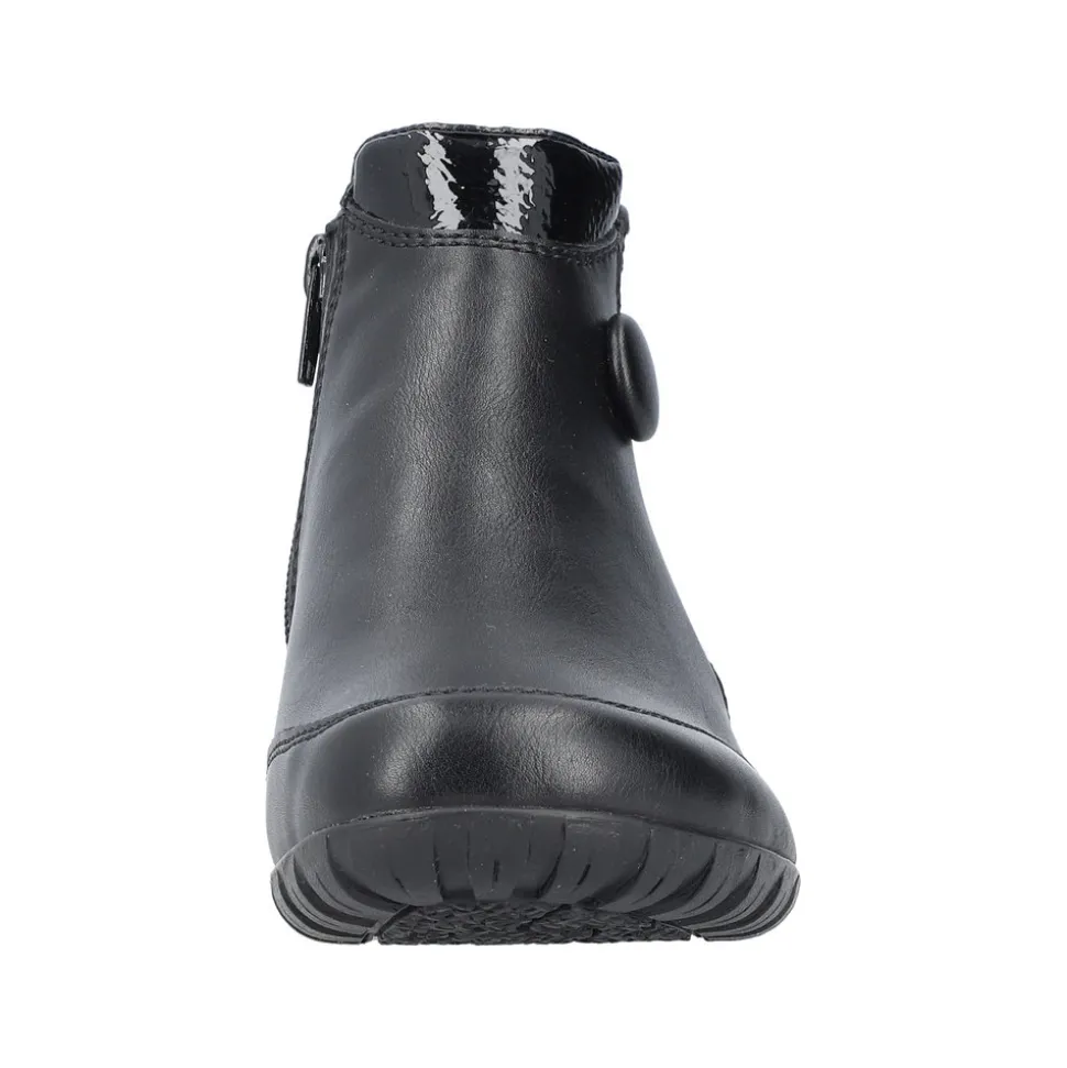 Rieker støvle til dame i sort. Oplev uovertruffen komfort med Rieker Antistress støvler, der er udstyret med en stødabsorberende TR/gummisål for en blød og behagelig gang. Støvlerne har ekstra vidde i forfoden, hvilket giver dine fødder mere plads og komfort. Den varme tekstilforing holder dig varm på kolde dage, mens elastikpanelet og lynlåsen på indersiden gør det nemt at tage støvlerne af og på. Den foret og udtagelige indlægssål giver ekstra komfort og tilpasning. For et strejf af elegance er støvlerne designet med en lak detalje ved åbningen, der tilføjer et sofistikeret finish. Træd ombord i denne ankelstøvle til dame fra Rieker og mærk forskellen!
