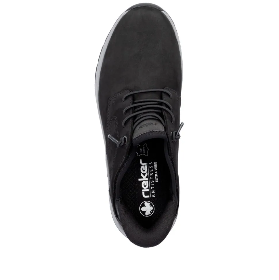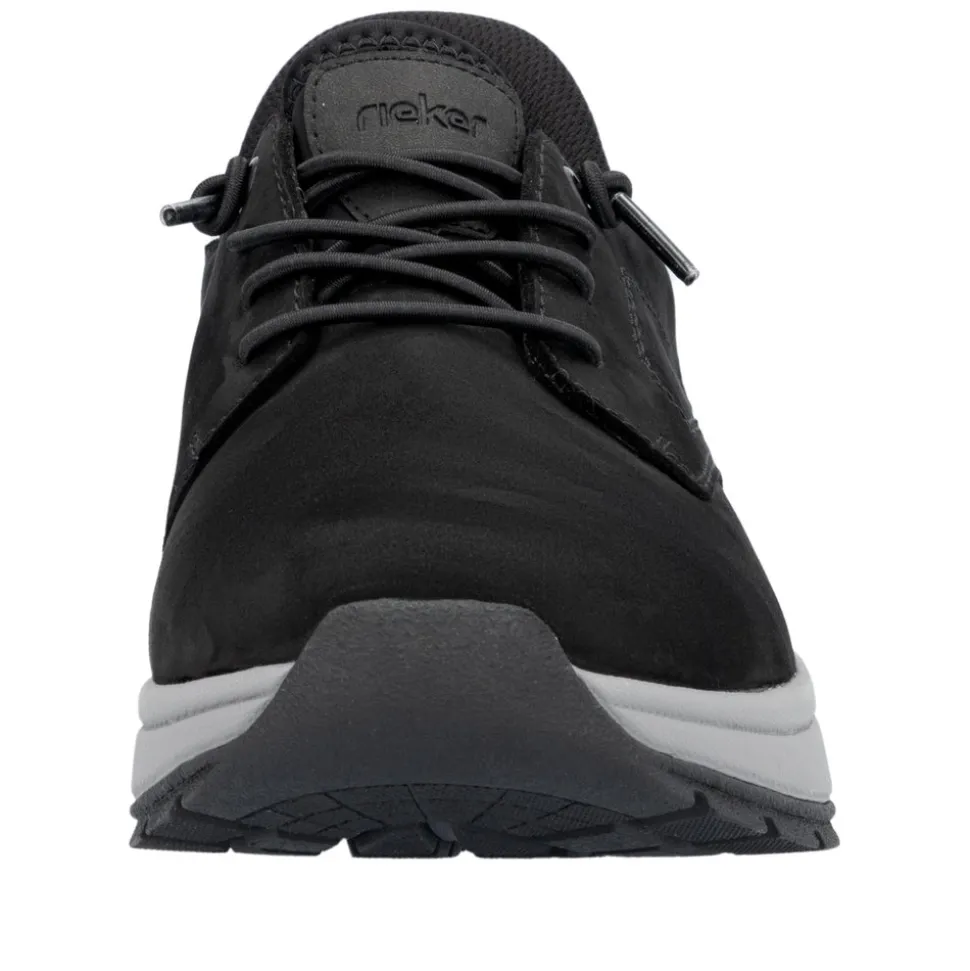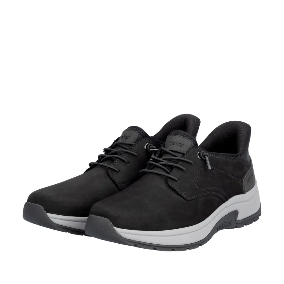 Rieker Ready 2 Go herre i sort. Denne sneakers fra Rieker er designet med den innovative Hands Free Ready 2 Go teknologi, der gør det nemt og hurtigt at tage skoen på uden brug af hænder med den faste hælkappe og den elastiske snøring. Den fleksible og ultralette sål giver dine fødder optimal komfort ved hvert skridt, mens den polstrede og udskiftelige indersål sikrer ekstra bekvemmelighed. Modellen er designet i ekstra bredde (H), hvilket gør dem særligt velegnede til bredere fødder. Overmaterialet er ruskind, mens indersiden og dæksålen er lavet af tekstil. Ydersålen består af EVA/gummi, som giver både støtte og fleksibilitet. En alsidig sko, der kombinerer komfort og stil på bedste vis.