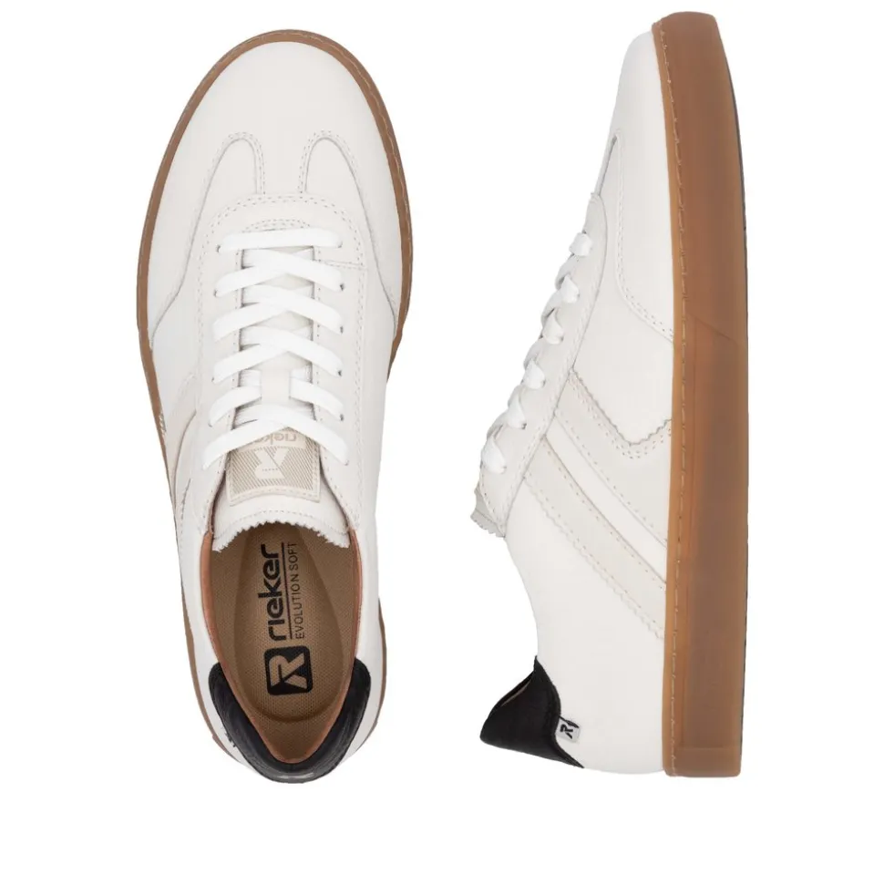 Rieker Revolution sneakers til herre i hvid. Opgrader din sko-garderobe med vores hvide Rieker sneakers til mænd, der emmer af trendy retro-stil. Fremstillet af førsteklasses glat læder, balancerer disse sneakers elegance og funktionalitet på imponerende vis. Med en ultralet, super blød EVA-indlægssål, der løfter din gå-oplevelse til nye højder, og en polstret, udtagelig indlægssål med støddæmpende egenskaber, sikrer disse sko maksimal komfort hele dagen. Det åndbare læderfor holder dine fødder friske og behagelige. Takket være komfortvidden (G – G ½) sidder skoen perfekt til din fod, hvilket gør dine skridt lette og selvsikre. Oplev en mere behagelig og stilfuld gang med de fantastiske Rieker Revolution sneakers.