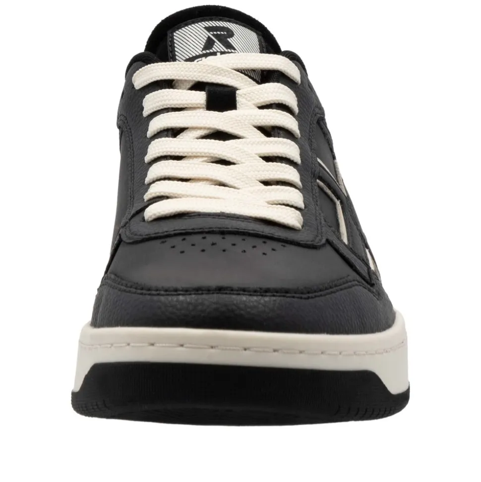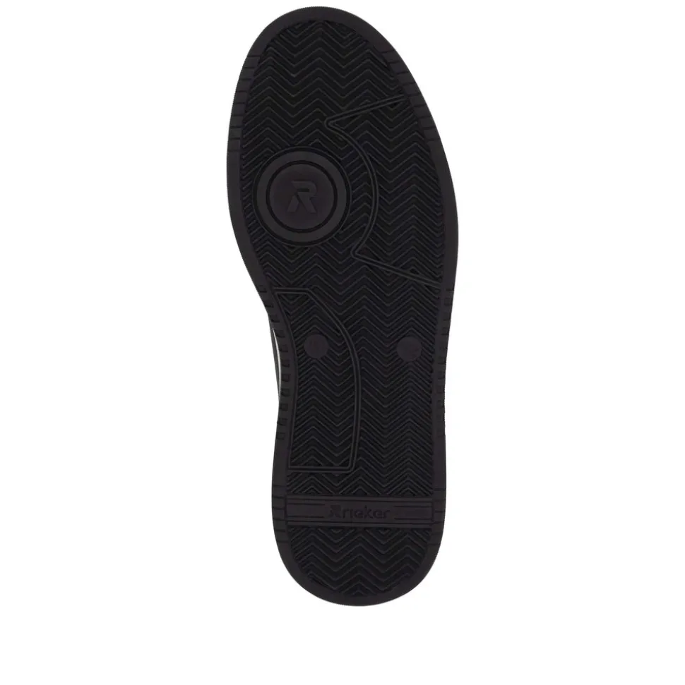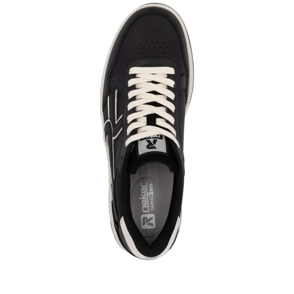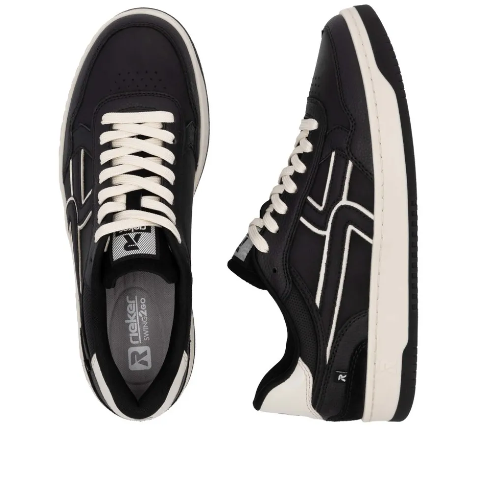 Rieker Revolution sneakers til herre i sort. Disse sorte sneakers med en overdel i skind gør lange gåture og stående aktiviteter til en leg! Snøresystemet sikrer en optimal pasform på foden. Den fleksible og super lette sål giver en enestående følelse af velvære ved hvert skridt. Herre sneakers er udstyret med den buede Swing2GO indersål, der giver dine fødder et ekstra energiboost. Indersålen kan også skiftes efter behov.