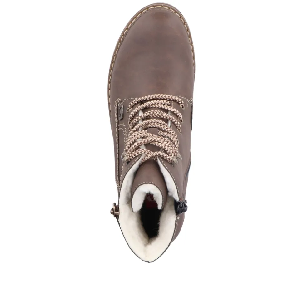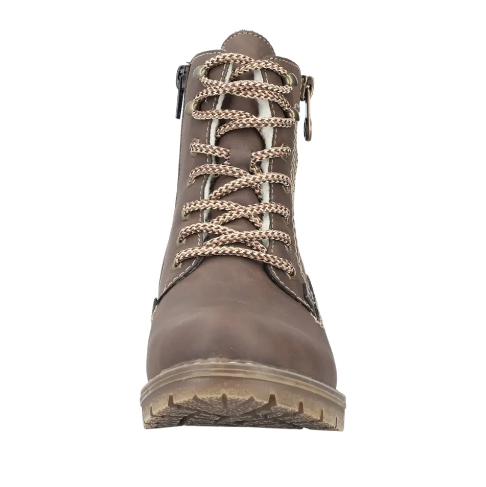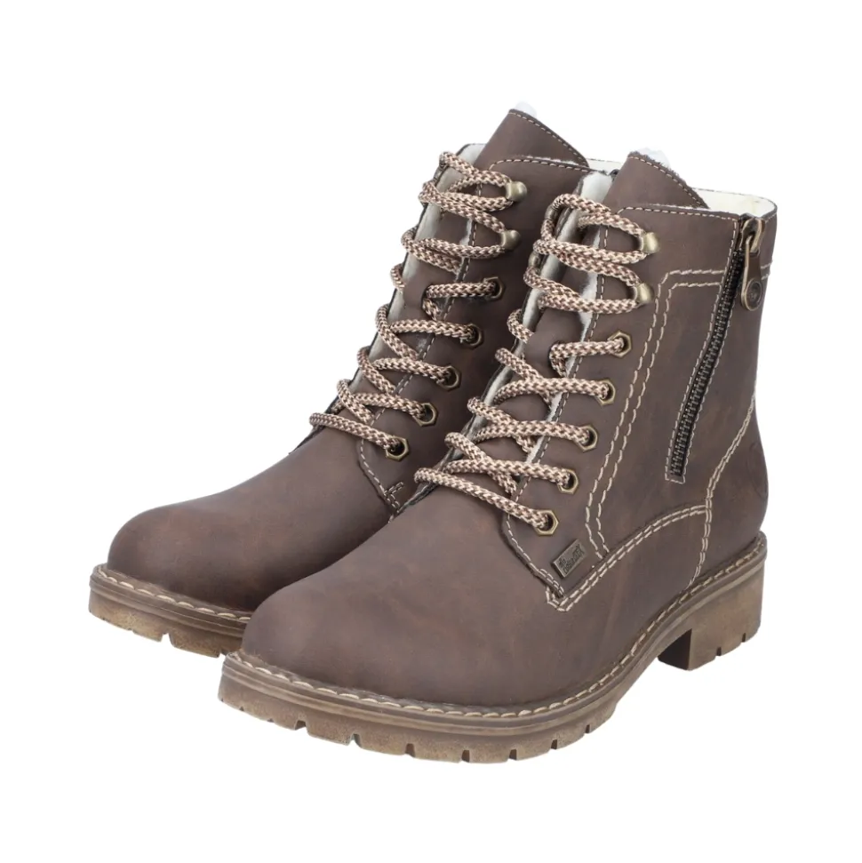 Rieker vinterstøvle til dame i brun. Disse snørestøvler fra Rieker til damer kombinerer alt, hvad du har brug for: komfort, funktion og naturligvis et stilfuldt design. Med den særlige konstruktion er støvlen både robust og fleksibel, hvilket sikrer, at der ikke opstår skader mellem sålen og skaftet. Støvlen har både en lynlås og snørebånd, hvilket giver ekstra funktionalitet og en perfekt pasform. Den skridsikre sål med en ca. 3 cm. blokhæl sikrer et stabilt fodfæste, mens den ekstra bløde indersål giver en komfortoplevelse i særklasse. Den vandafvisende RiekerTEX-membran beskytter dine fødder mod regn og vind, og det varme, bløde foer holder dem dejligt varme hele dagen.