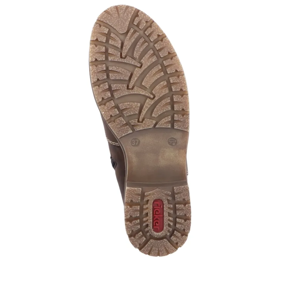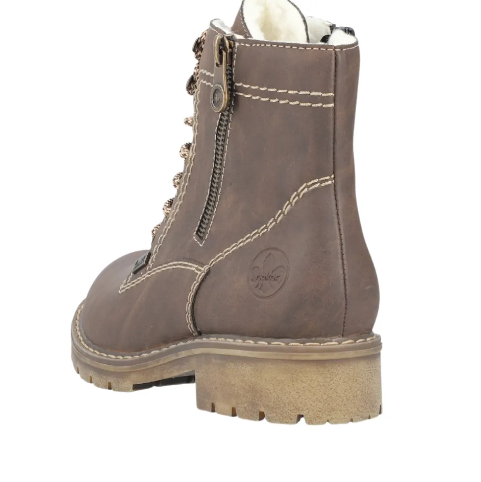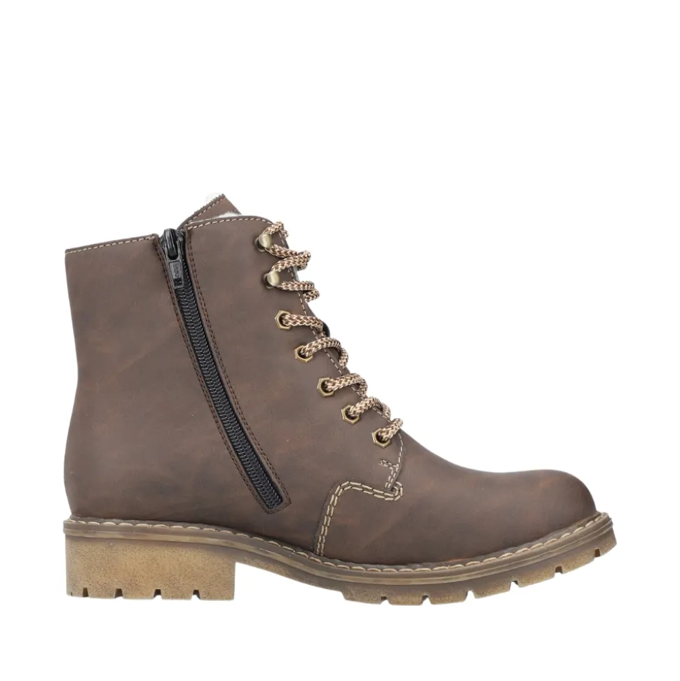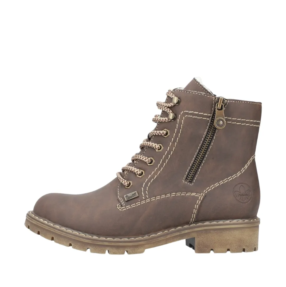 Rieker vinterstøvle til dame i brun. Disse snørestøvler fra Rieker til damer kombinerer alt, hvad du har brug for: komfort, funktion og naturligvis et stilfuldt design. Med den særlige konstruktion er støvlen både robust og fleksibel, hvilket sikrer, at der ikke opstår skader mellem sålen og skaftet. Støvlen har både en lynlås og snørebånd, hvilket giver ekstra funktionalitet og en perfekt pasform. Den skridsikre sål med en ca. 3 cm. blokhæl sikrer et stabilt fodfæste, mens den ekstra bløde indersål giver en komfortoplevelse i særklasse. Den vandafvisende RiekerTEX-membran beskytter dine fødder mod regn og vind, og det varme, bløde foer holder dem dejligt varme hele dagen.