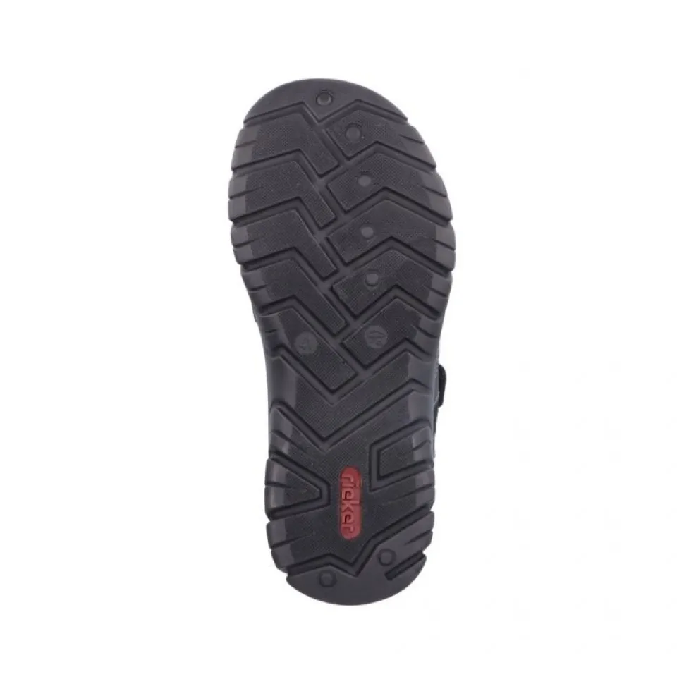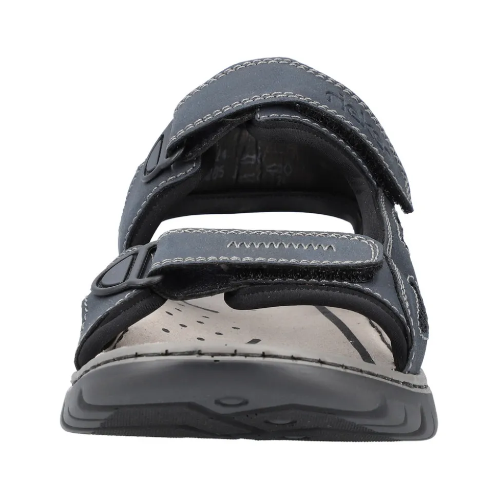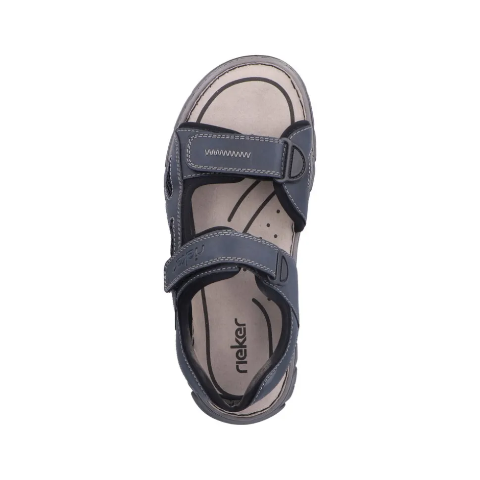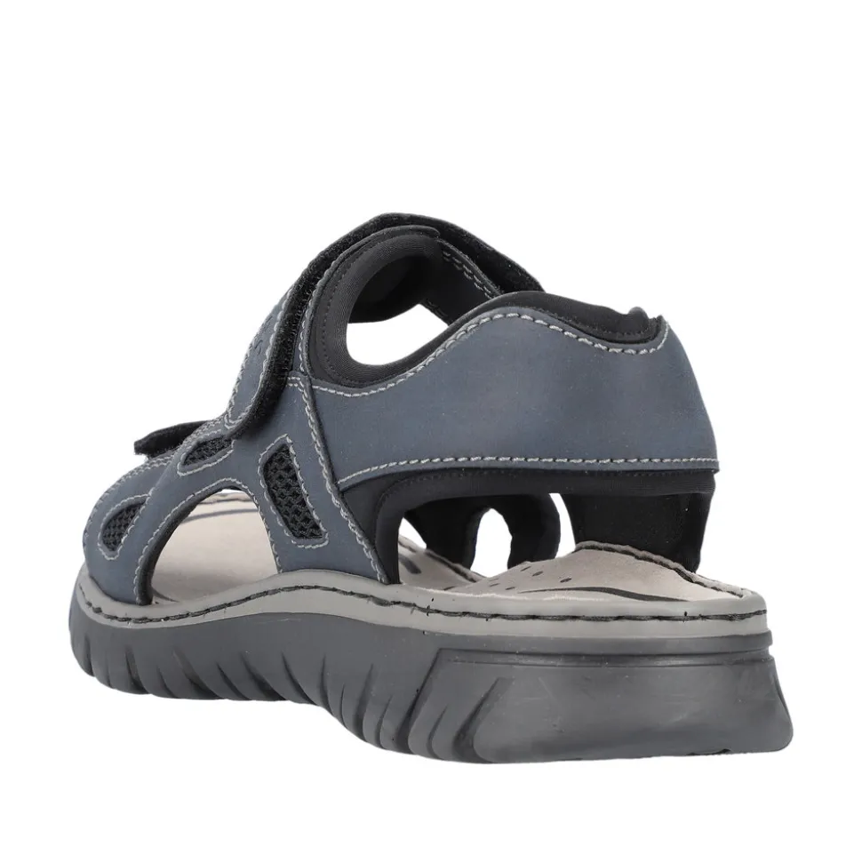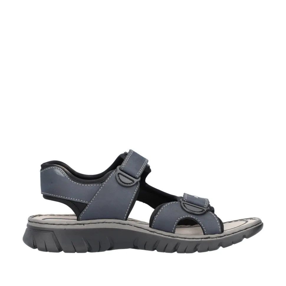 Rieker sandal til herre i blå. Disse Rieker vandresandaler til herrer forener stil og komfort i hverdagen. Med kvalitet og design i højsædet, tilbyder disse sandaler ikke kun et smart udseende, men også den nødvendige komfort. Den individuelle tilpasning til foden opnås let takket være remme og en kraftig velcrolukning. For ekstra støtte har sandalen en bred hælstrop. De dekorative syninger tilføjer det perfekte touch og giver et iøjnefaldende udseende. Den lette og stødabsorberende sål sikrer en behagelig følelse hele dagen. Med komfortbredden G får tæerne ekstra bevægelsesfrihed. Oplev mode og velvære i Rieker-stil!