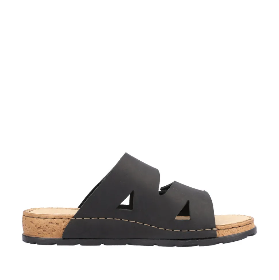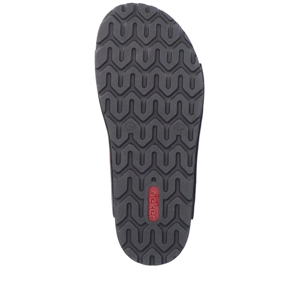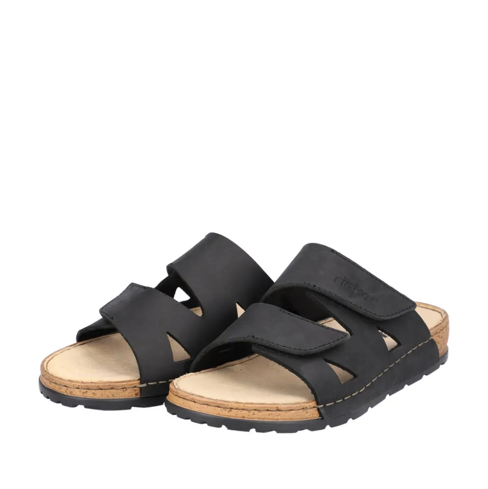 Rieker sandal i sort til herre. Denne sandal er elegant i sort og har to justerbare velcroremme, der sikrer optimal tilpasning til din fod. Sandalen er fremstillet i en blød og let kvalitet, hvilket giver en fremragende pasform og komfort. Slip-in funktionen gør det nemt at tage sandalerne af og på. De bløde, fleksible såler og den stødabsorberende bund giver ekstra støtte og komfort til dine fødder. Indersålen er ekstra blød for at sikre maksimal komfort.