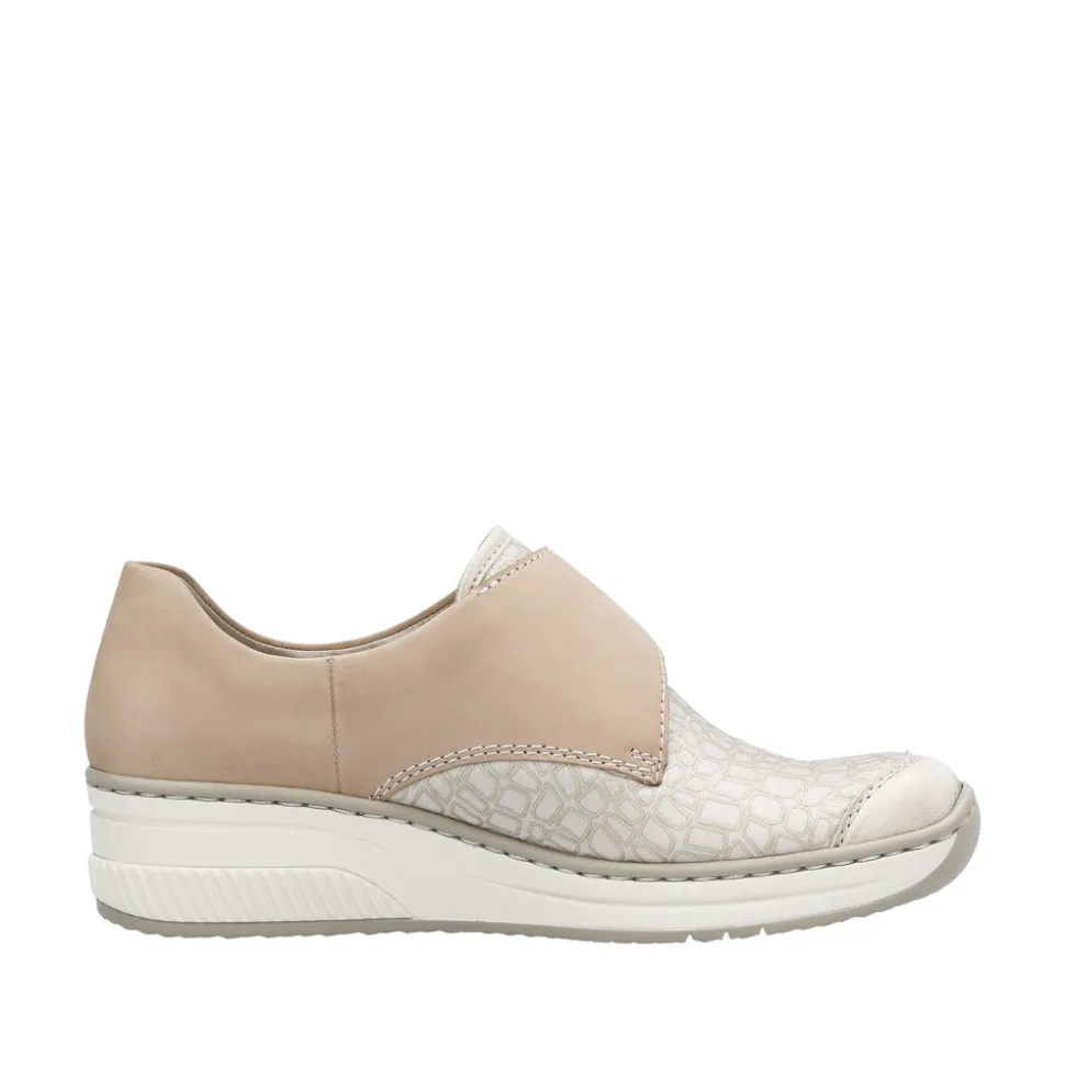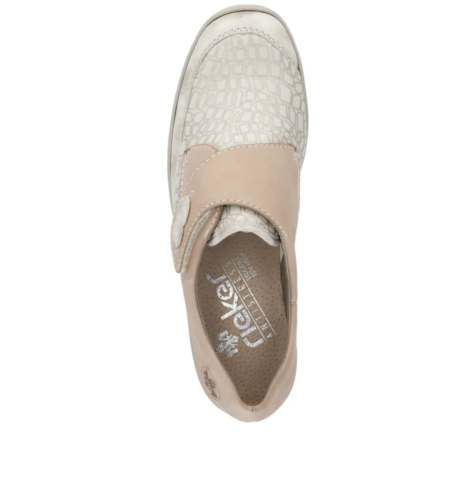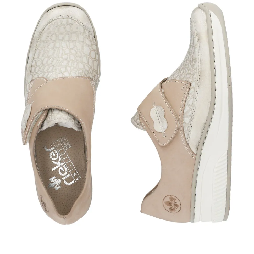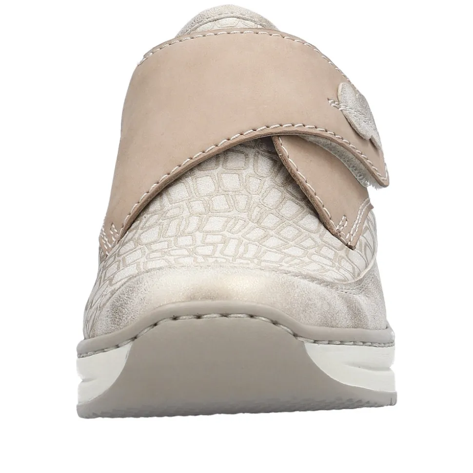 Rieker sko til dame i beige/sand. Denne sko tilbyder masser af kvalitet og komfort, og med sin velcrolukning gør den de…