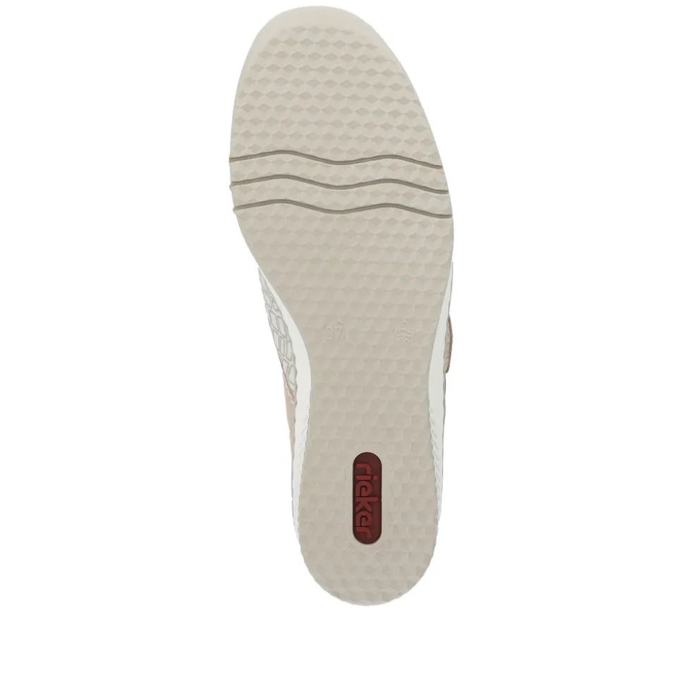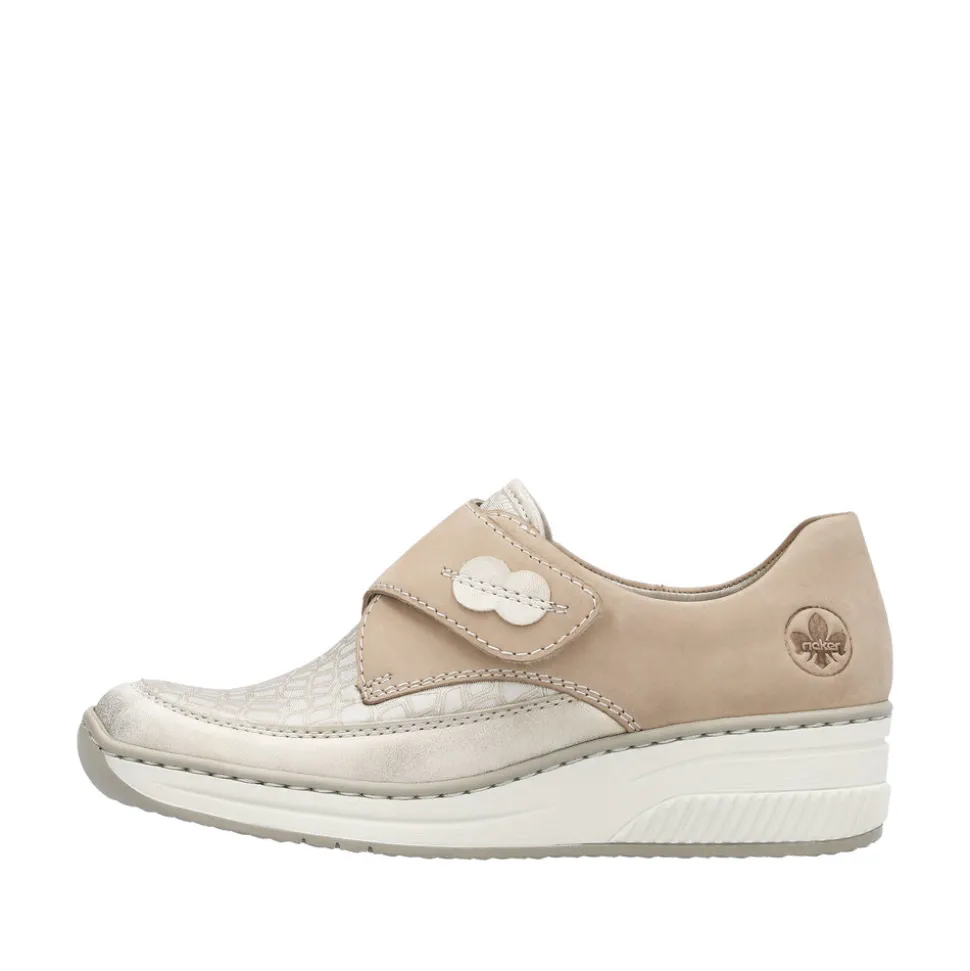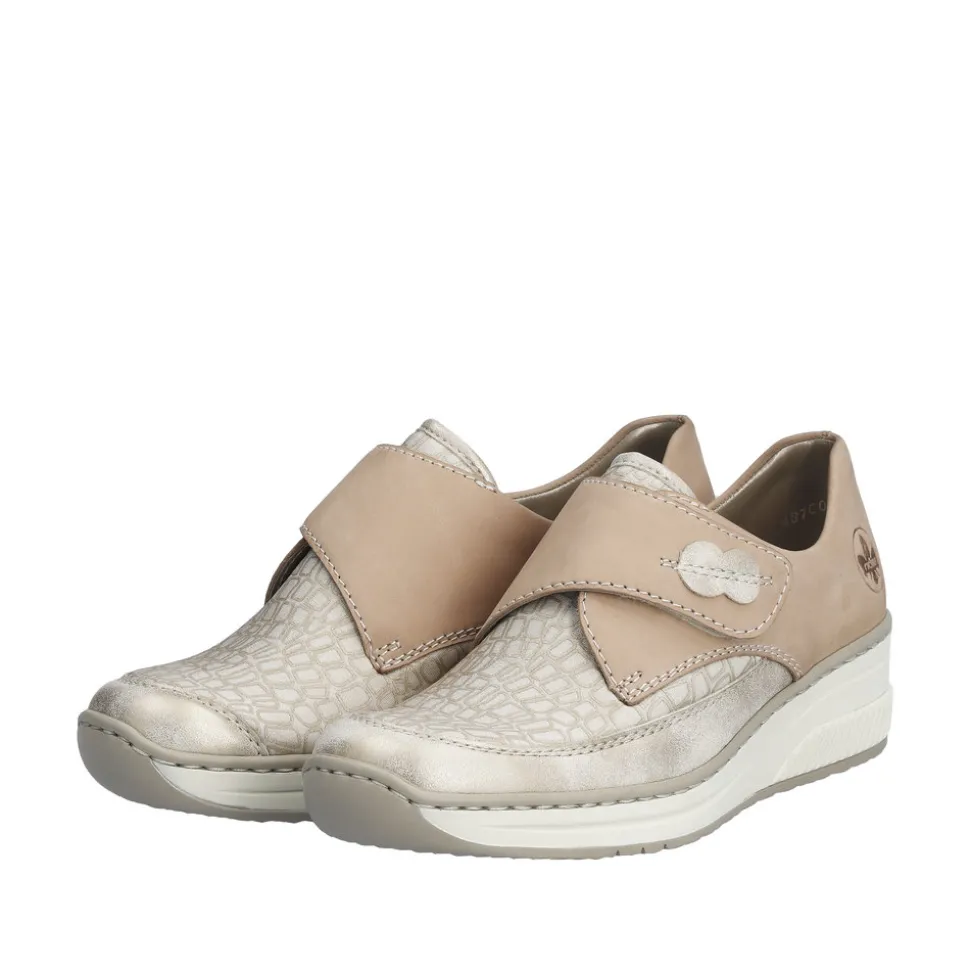 Rieker sko til dame i beige/sand. Denne sko tilbyder masser af kvalitet og komfort, og med sin velcrolukning gør den det let at tage skoen af og på samt justere pasformen præcist til din fod. Overdelen i naturligt læder sikrer en holdbar konstruktion, der strækker sig omkring åbningen og velcrolukningen. De stødabsorberende såler aflaster dine fødder med hvert skridt, mens det flotte guld mønster på forsiden af skoen tilføjer et elegant touch. Takket være den lette konstruktion vil du næsten glemme, at du har skoen på.