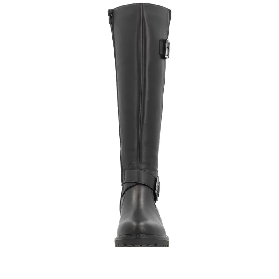 Remonte lange støvle i sort til dame. Pas på, denne biker inspireret støvle med en overdel i glad læder kan hurtigt blive din nye favorit! Disse dybsorte remonte langskaftede støvler i glat læder har alt, hvad du behøver for at opnå både komfort og stil. Lynlåsen gør det nemt at tage dem af og på, mens de dekorative spænder på siden giver et cool og afslappet udtryk og elastikken i læggen tilpasser sig sin læg. Den stødabsorberende, fleksible sål med 3 cm. blokhæl og den udtagelige indersål sikrer maksimal komfort hele dagen. Med sin (G – G ½) komfortbredde er denne lange støvle et ideelt valg for dig, der ønsker både funktionalitet og elegance.