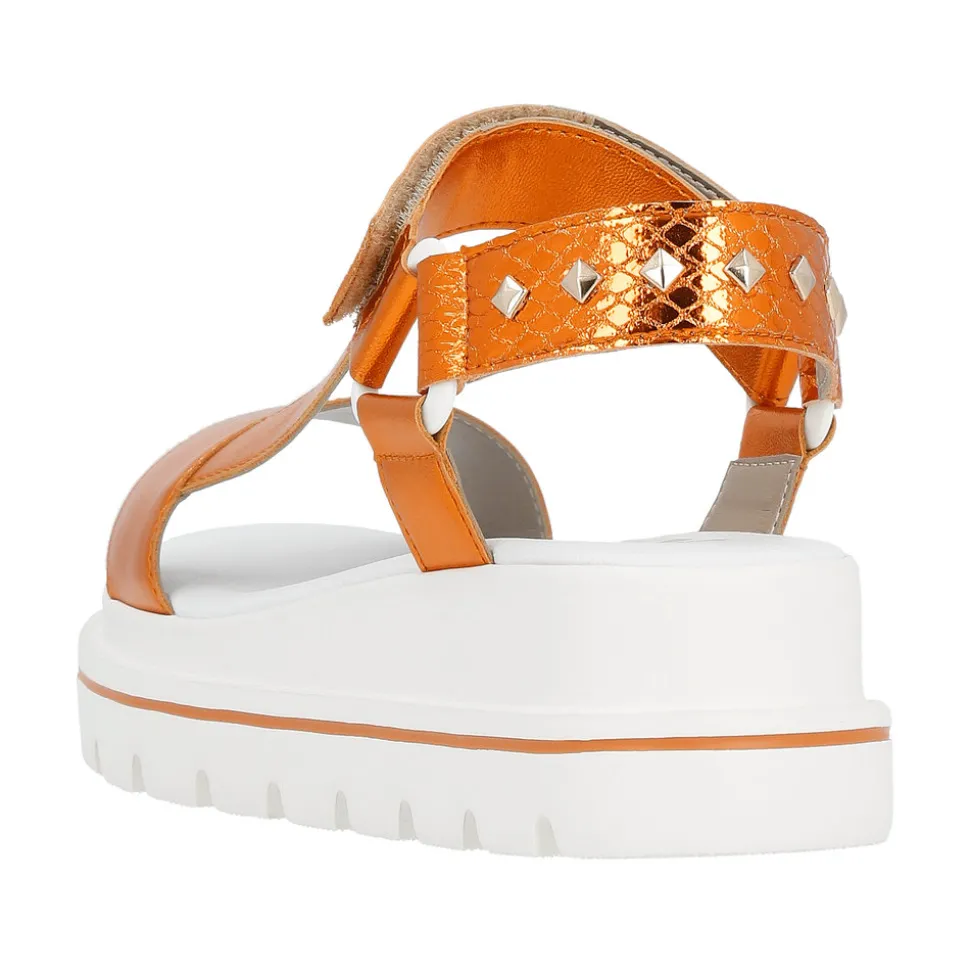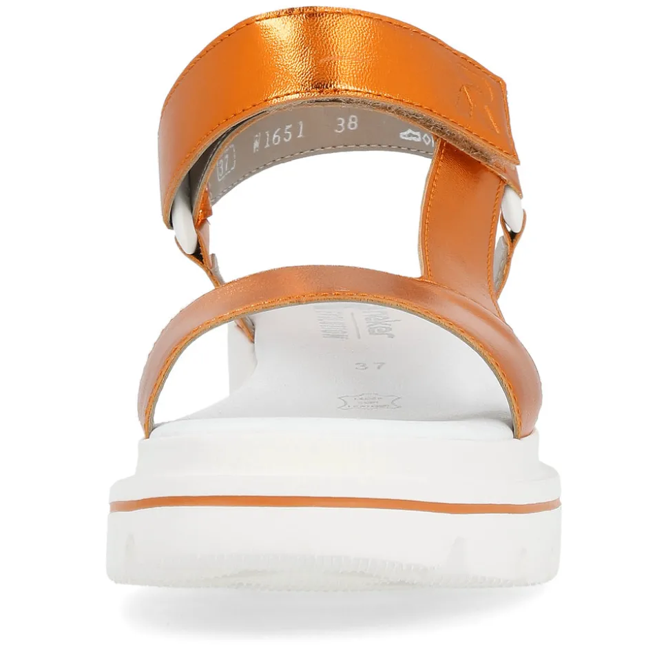 Rieker Revolution sandal til dame i orange. Moderne orange sandal med en sofistikeret hvid sål, der giver sandalen et ekstra touch af stil. Lavet af luksuriøst skind udvendigt og med en behagelig blød indersål af skind. De elegante guld nitter bagpå tilfører sandalen et moderne twist. En robust sål med en lille kilehæl på cirka 5 cm sikrer stabilitet, mens den praktiske velcrorem gør det let at tage sandalen af og på.