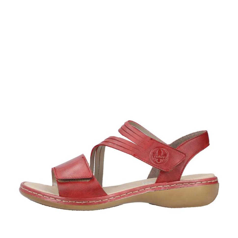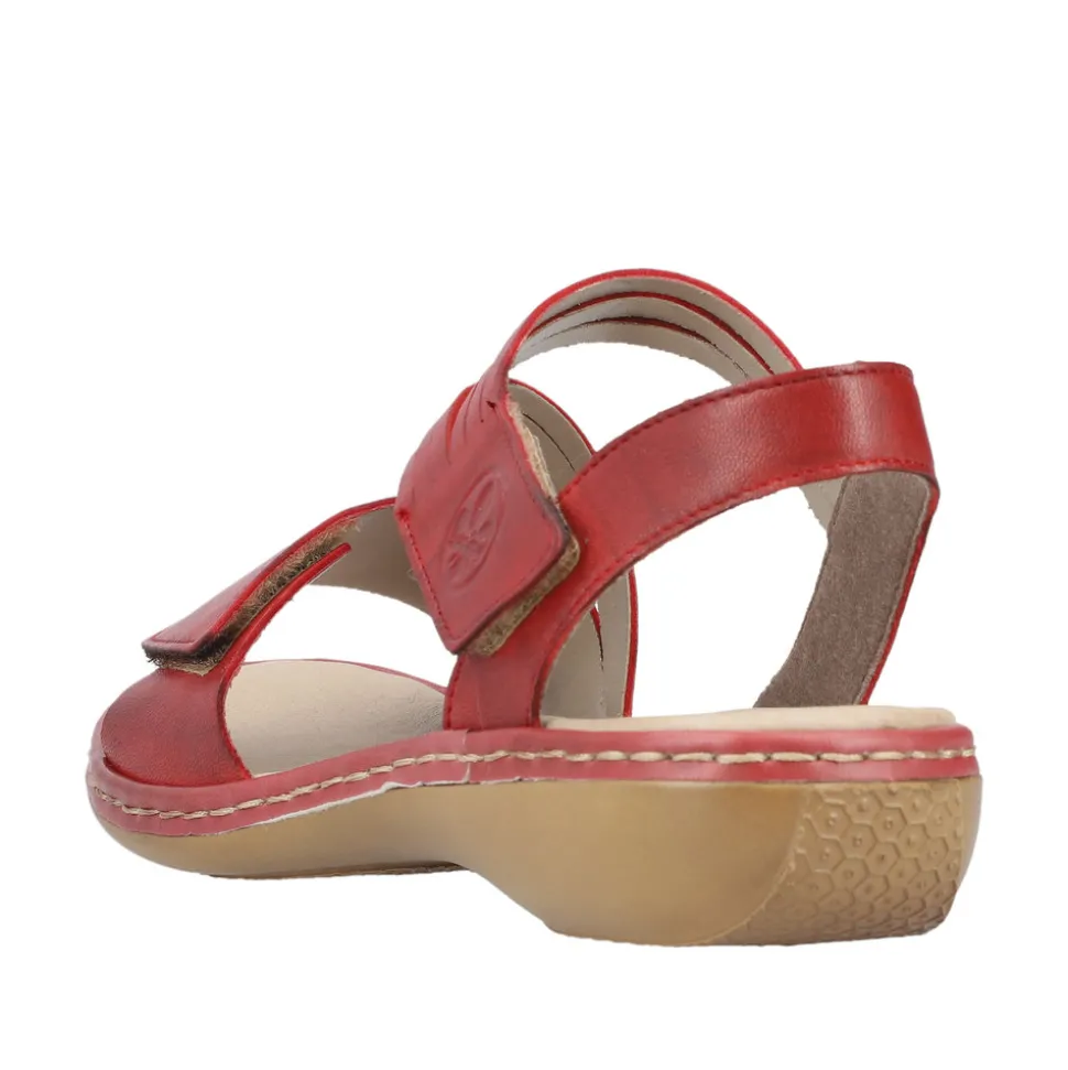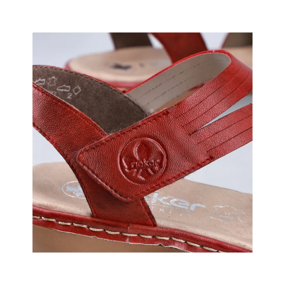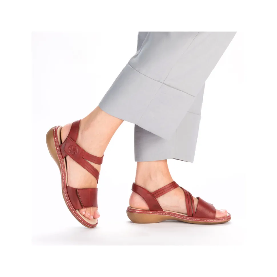 Rieker sandal til dame i rød. Forkæl dine fødder med denne fantastiske sandal, der kombinerer stil og funktionalitet. Udstyret med velcrolukninger på siden og foran, giver den mulighed for at justere pasformen til din fod. Hælremmen sikrer en stabil og behagelig pasform hele dagen. Lavet af førsteklasses læder og designet med bløde indlæg samt stødabsorberende egenskaber, garanterer denne sandal ekstraordinær komfort, trin for trin.