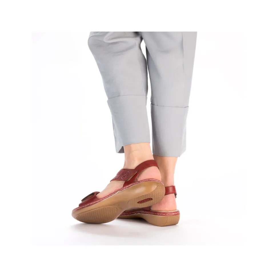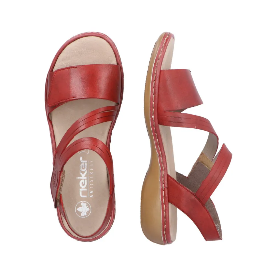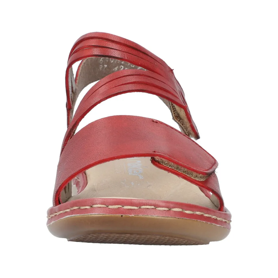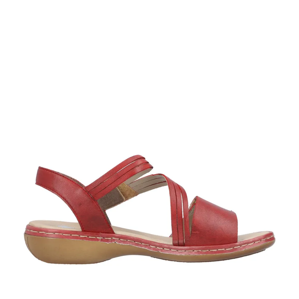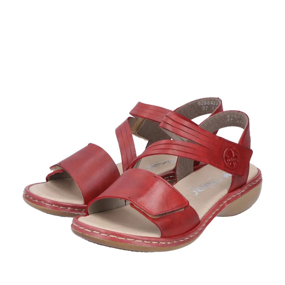 Rieker sandal til dame i rød. Forkæl dine fødder med denne fantastiske sandal, der kombinerer stil og funktionalitet. Udstyret med velcrolukninger på siden og foran, giver den mulighed for at justere pasformen til din fod. Hælremmen sikrer en stabil og behagelig pasform hele dagen. Lavet af førsteklasses læder og designet med bløde indlæg samt stødabsorberende egenskaber, garanterer denne sandal ekstraordinær komfort, trin for trin.