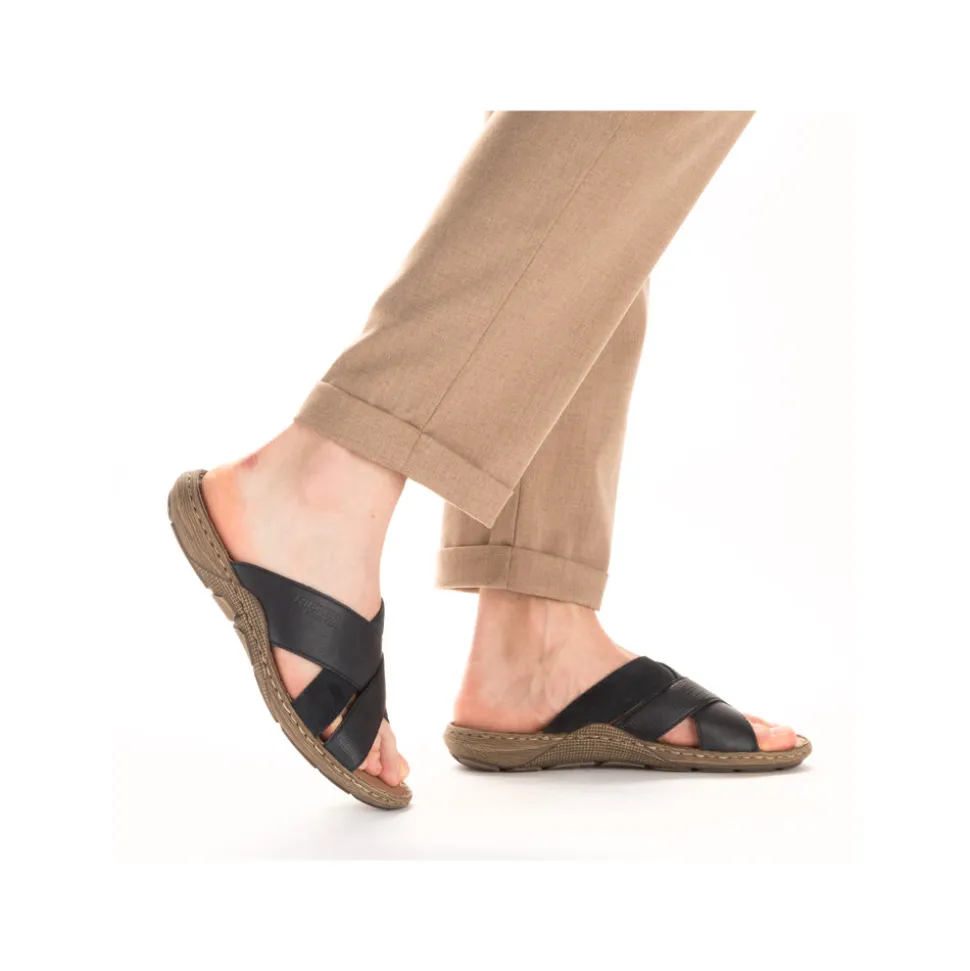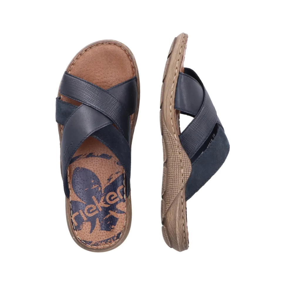 Rieker Sandal i Blå Til Herre. Super fin sandal/slenters fra Rieker i en flot mørk blå farve. Modellen har slip-in funktion og er derfor nem og hurtigt bare lige at hoppe i. Modellen har en super blød lædersål samt en fleksibel og stødabsorberende bund, hvilket giver optimal komfort og pasform for dine fødder. Sandalen har samtidig en dejlig funktionel og skridsikker bund.