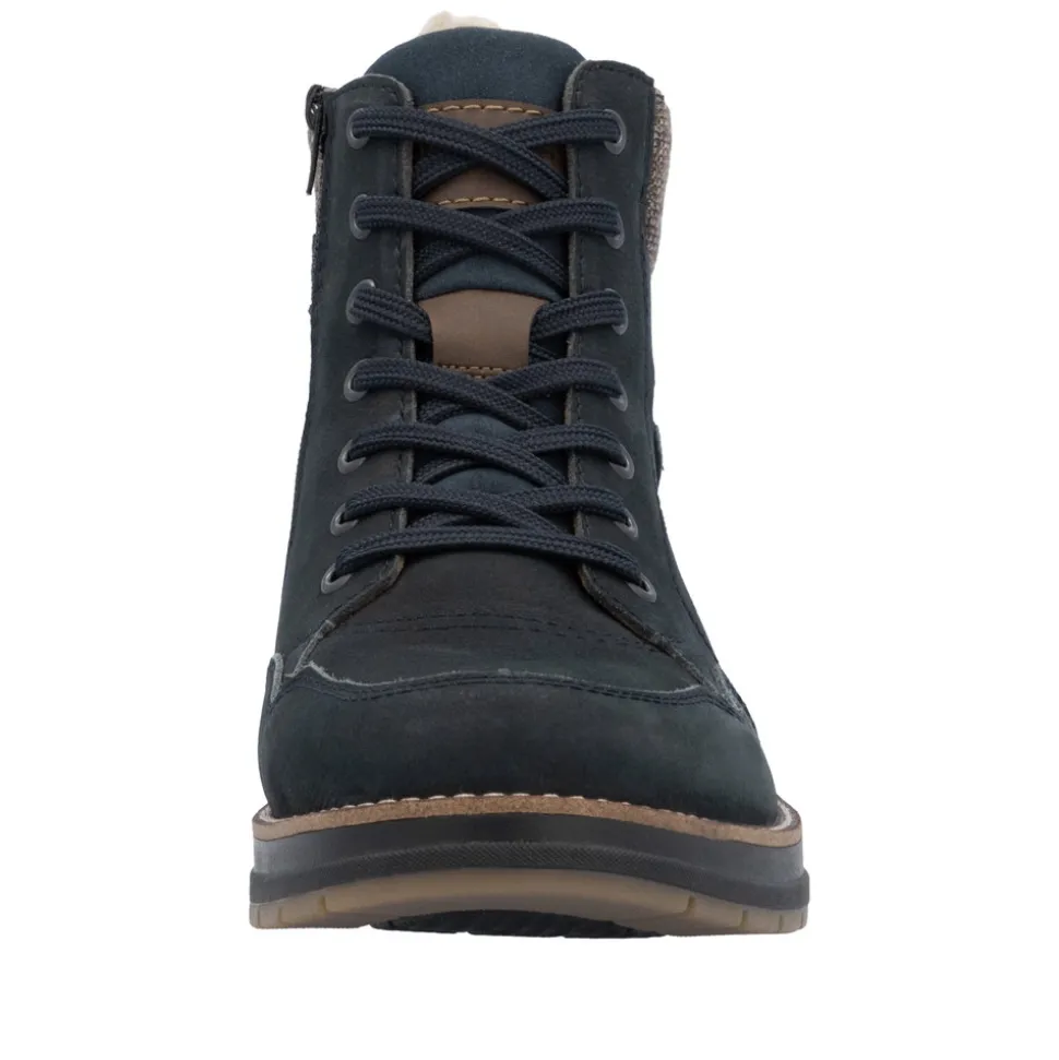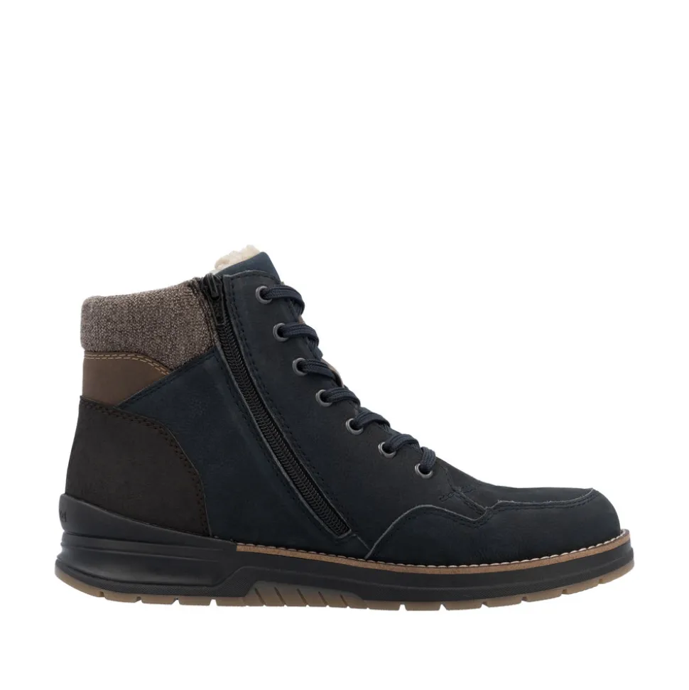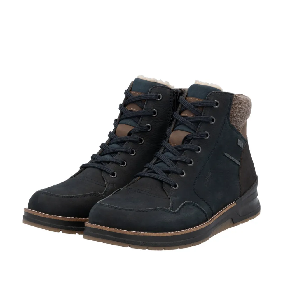 Rieker støvle til herre i blå. Disse mørkeblå snørestøvler i glat læder kombinerer et moderne look med høj komfort. Den praktiske kombination af snøring og lynlås gør det let at få dem af og på. Støvlerne er udstyret med en robust sål, der har Antistress-teknologi for øget komfort og skridsikkerhed hele dagen. Indersålen, der både er polstret og udtagelig, giver ekstra funktionalitet i dagligdagen. Med en ekstra bred pasform (H) er der god plads til forfoden, hvilket øger komforten. Støvlerne har desuden en varm uldforing og den velkendte RiekerTEX-teknologi, der holder dine fødder varme og tørre uanset vejret.