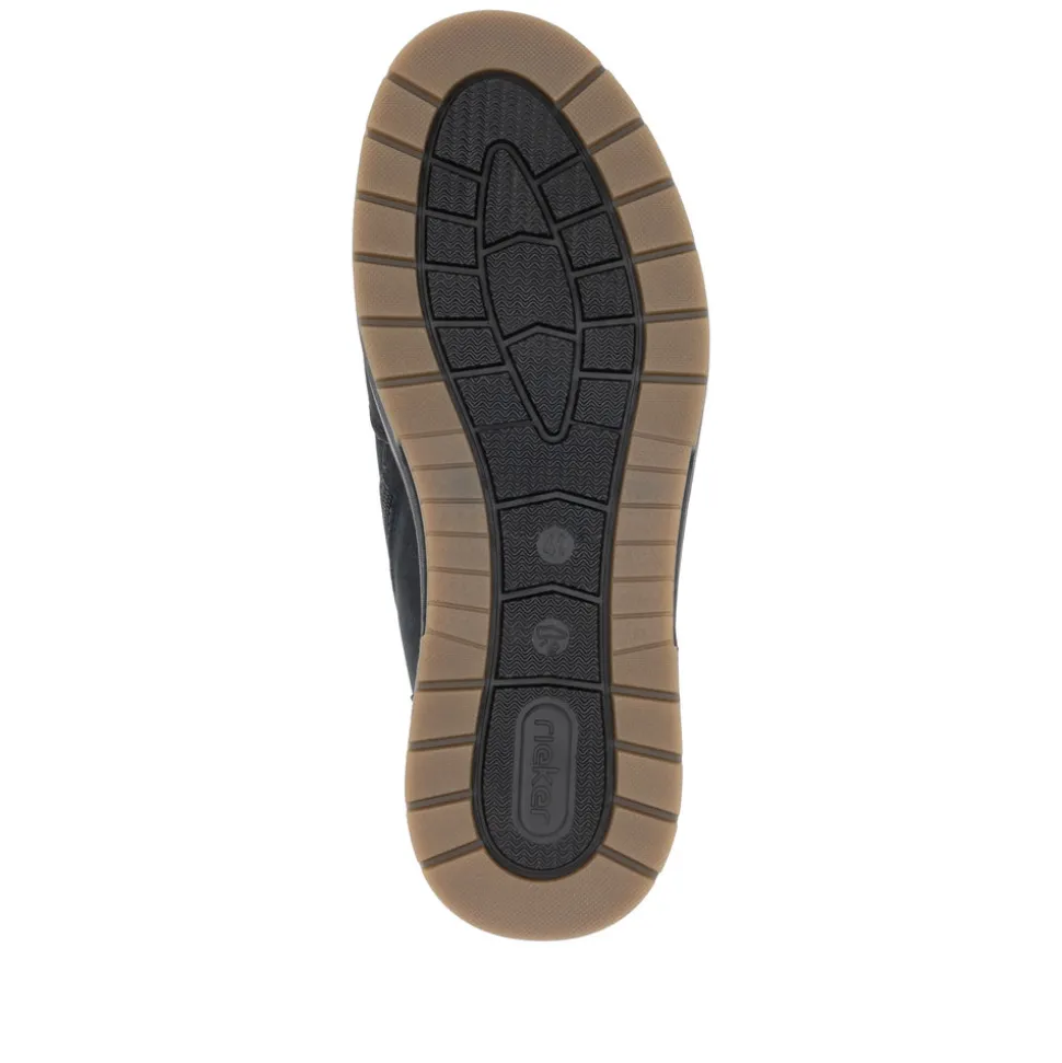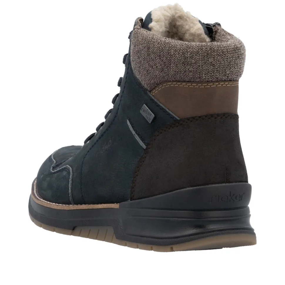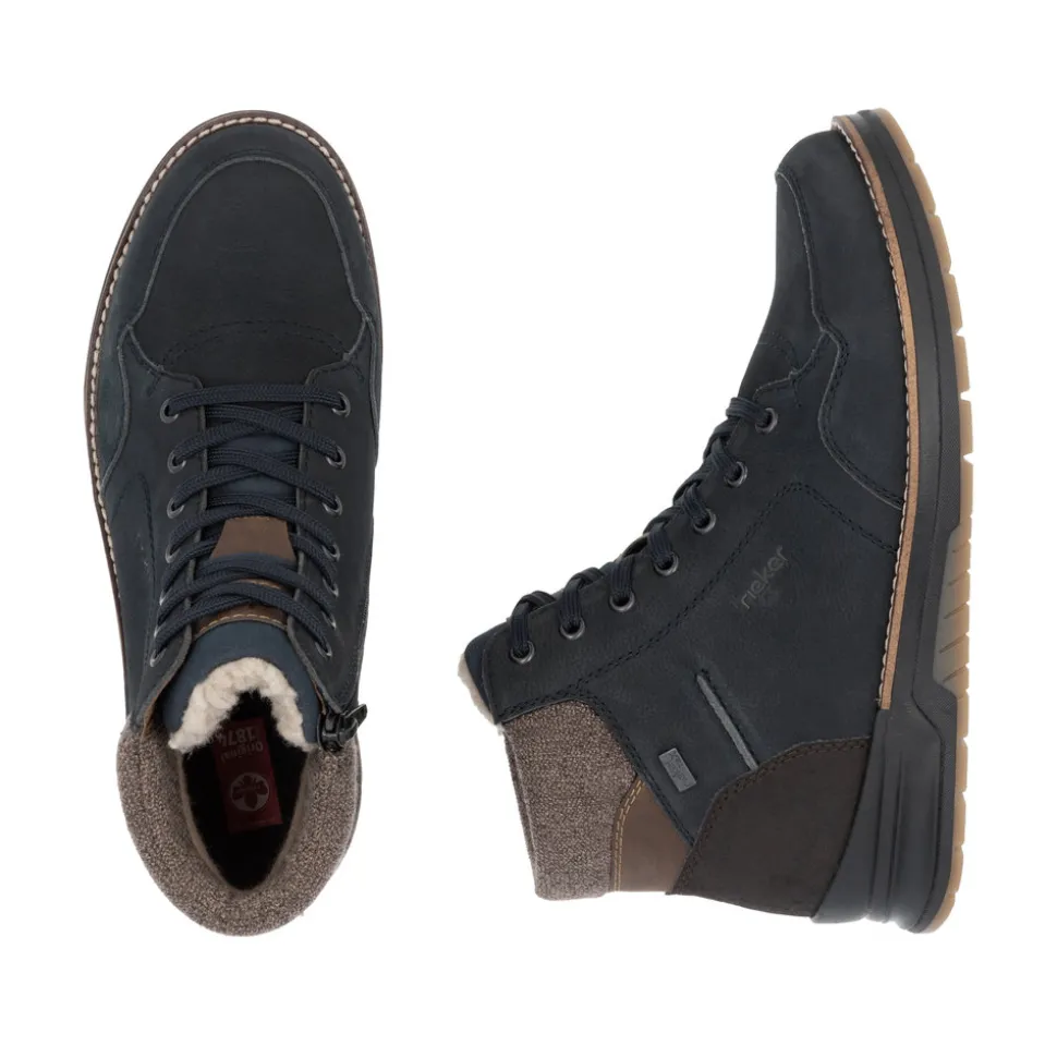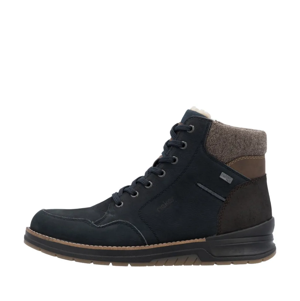 Rieker støvle til herre i blå. Disse mørkeblå snørestøvler i glat læder kombinerer et moderne look med høj komfort. Den praktiske kombination af snøring og lynlås gør det let at få dem af og på. Støvlerne er udstyret med en robust sål, der har Antistress-teknologi for øget komfort og skridsikkerhed hele dagen. Indersålen, der både er polstret og udtagelig, giver ekstra funktionalitet i dagligdagen. Med en ekstra bred pasform (H) er der god plads til forfoden, hvilket øger komforten. Støvlerne har desuden en varm uldforing og den velkendte RiekerTEX-teknologi, der holder dine fødder varme og tørre uanset vejret.