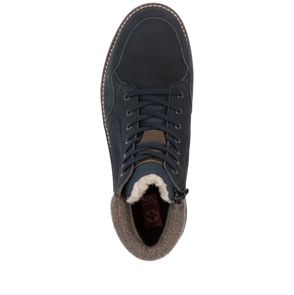 Rieker støvle til herre i blå. Disse mørkeblå snørestøvler i glat læder kombinerer et moderne look med høj komfo…