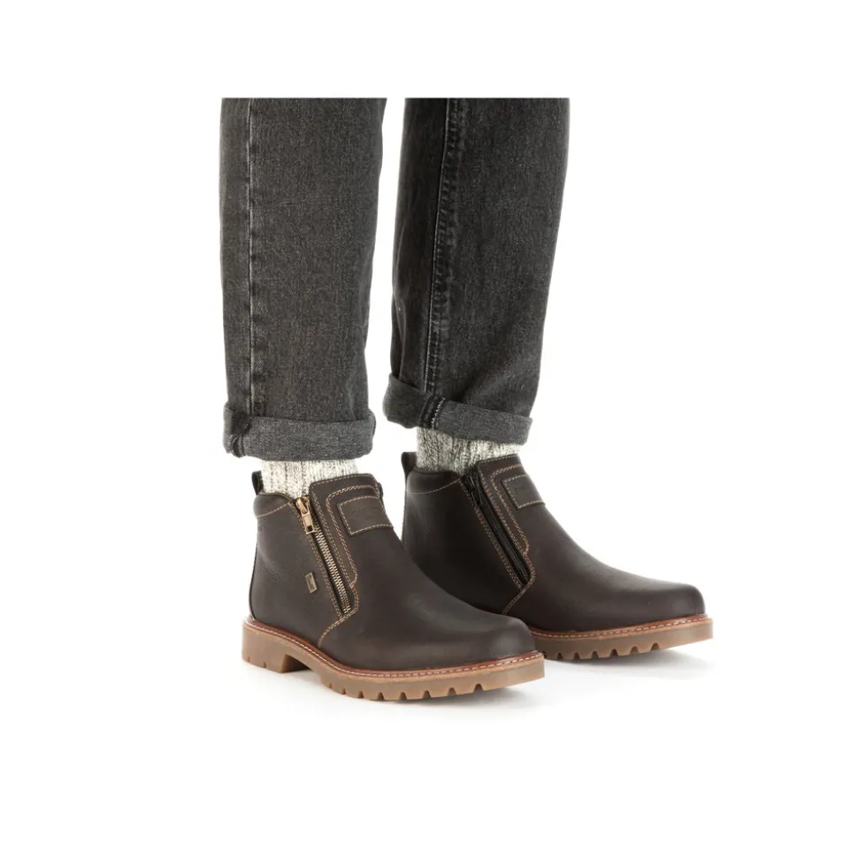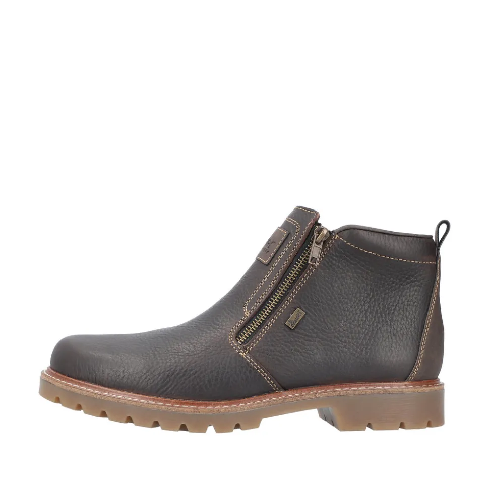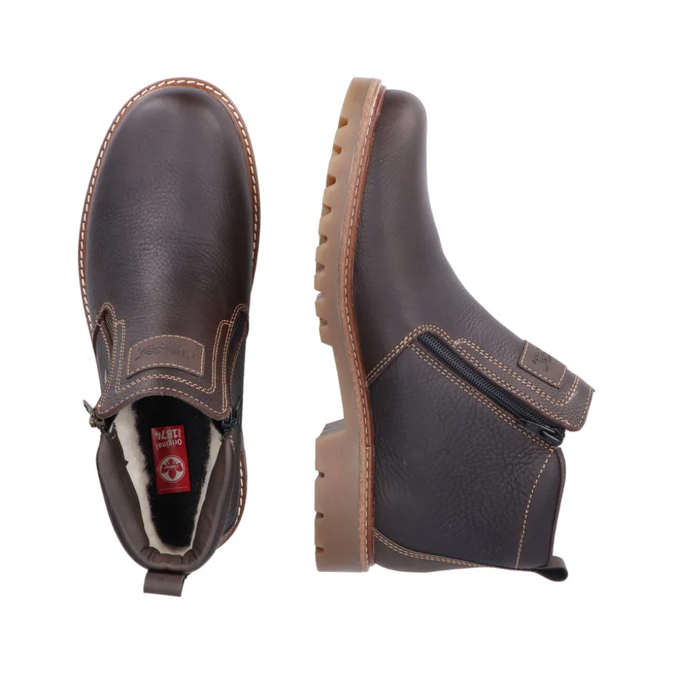 Rieker vinterstøvle i brun til herre. Opgrader din garderobe med denne smarte Rieker-støvle i en elegant brun nuance og smukke detaljer. Med lynlåse på begge sider bliver det både praktisk og nemt at tage støvlerne af og på. Takket være den indbyggede RiekerTex-teknologi er støvlerne kraftigt vandafvisende, hvilket sikrer dine fødder mod regn og fugtige forhold. Det bløde og varme uldfoer gør dem perfekte til kolde dage, mens den lækre skindoverflade tilføjer et eksklusivt touch. Med Rieker fibergrip under den stødabsorberende sål står du sikkert fast, selv på glatte overflader. Den ideelle støvle til vinterens udfordringer!