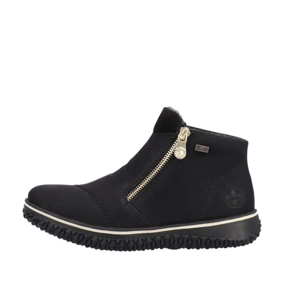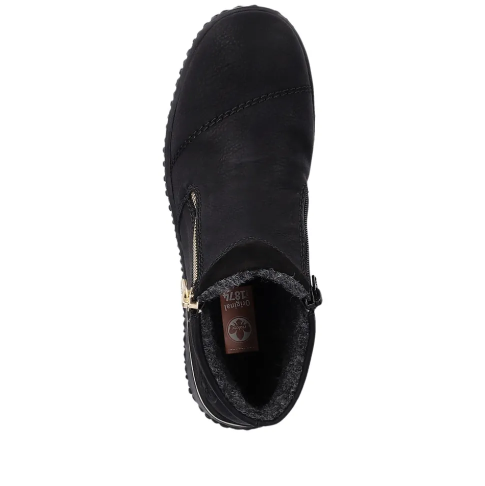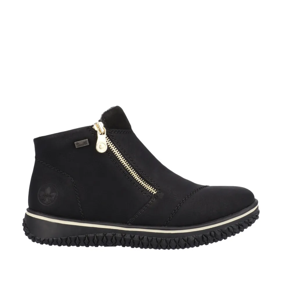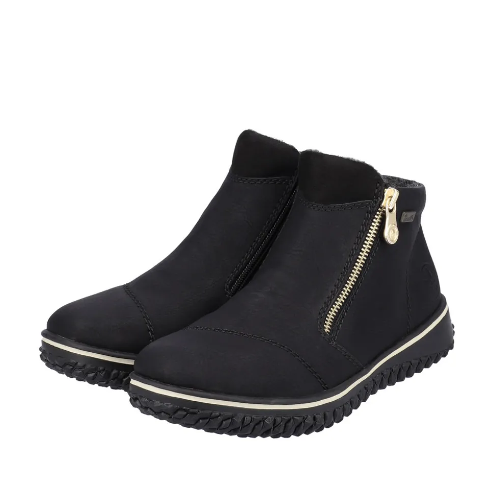 Rieker støvle i sort til dame. Med denne Rieker støvle er du klar til at tage verden med storm, uanset vejret. Den sorte støvle kombinerer stil og funktionalitet i ét. Med lynlåse på begge sider er den utrolig nem at tage af og på, hvilket gør den perfekt til den travle kvinde. Det bløde, varme foer sørger for, at dine fødder holdes komfortabelt varme hele dagen. Derudover sikrer RiekerTex-teknologien en kraftig vandafvisende effekt, så du kan gå trygt gennem regn og slud.