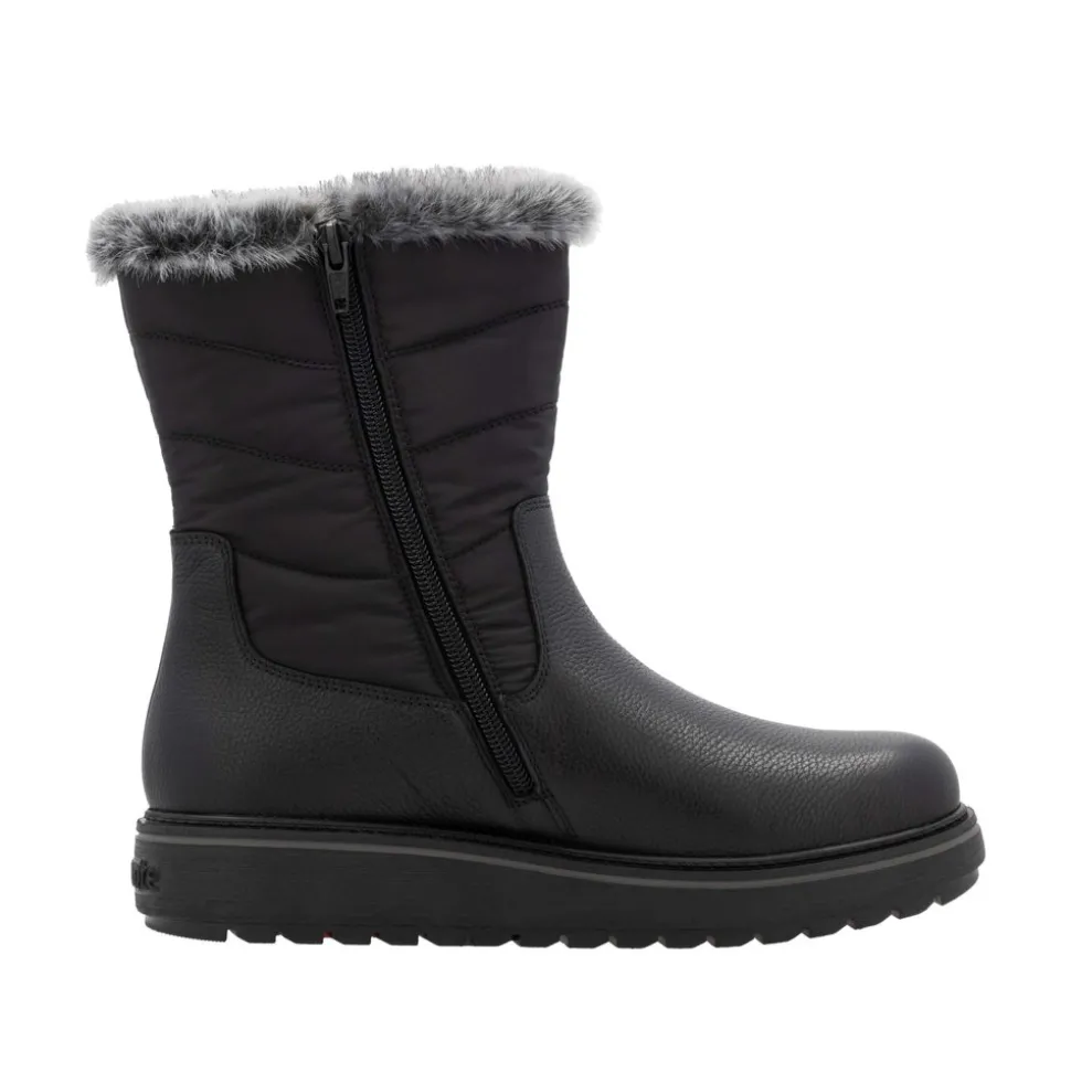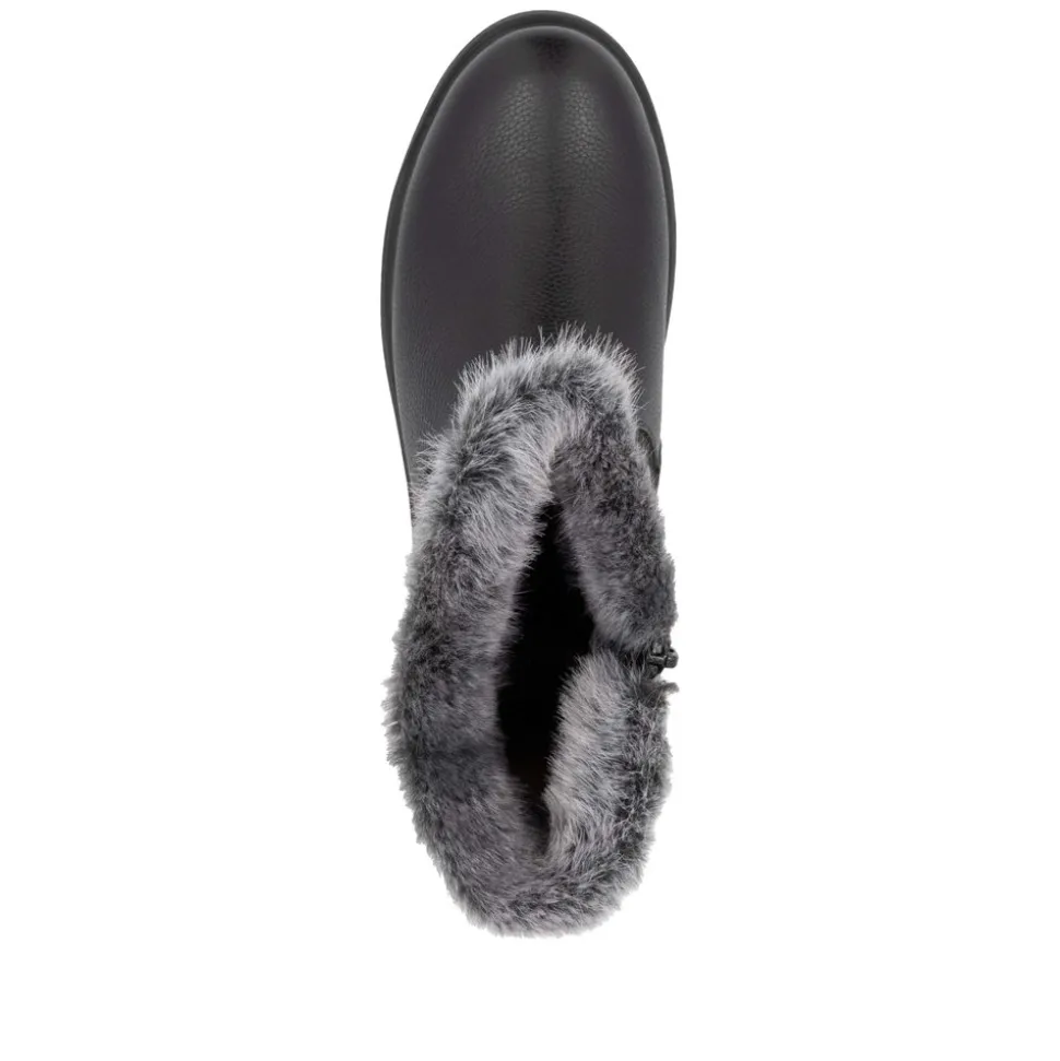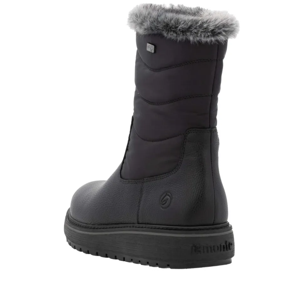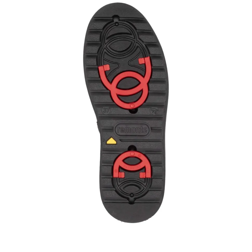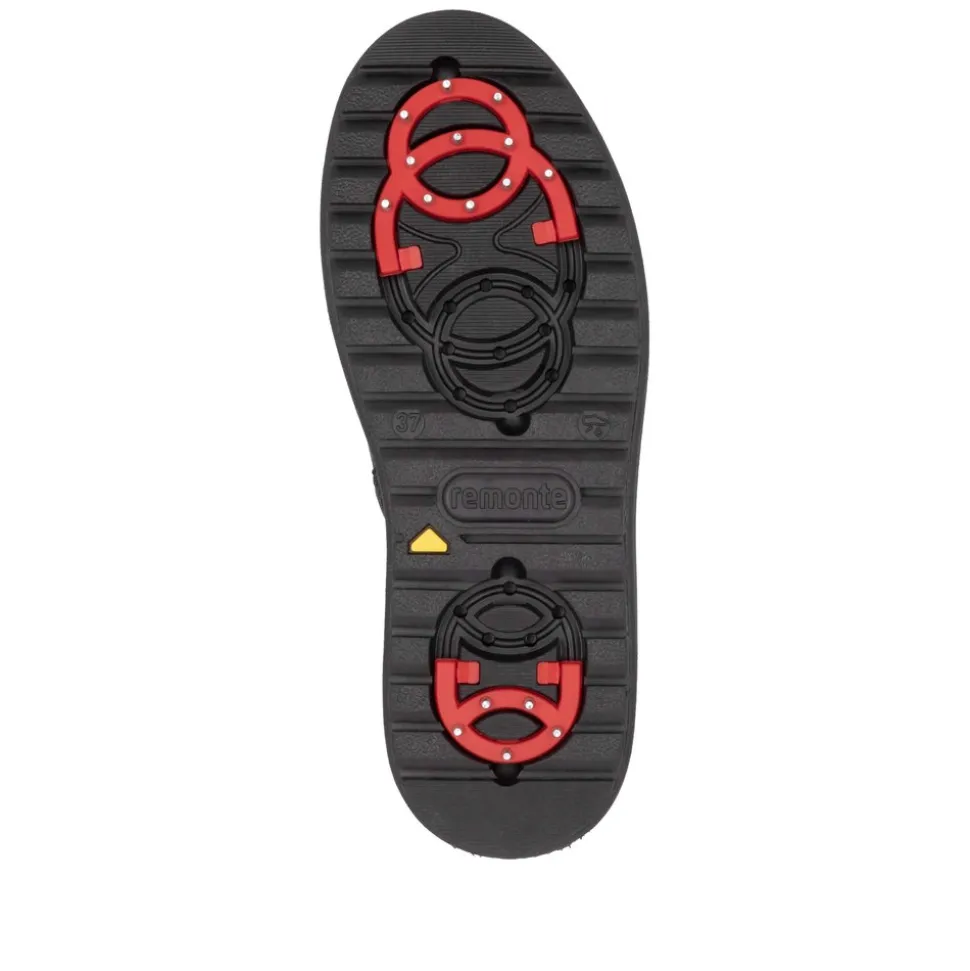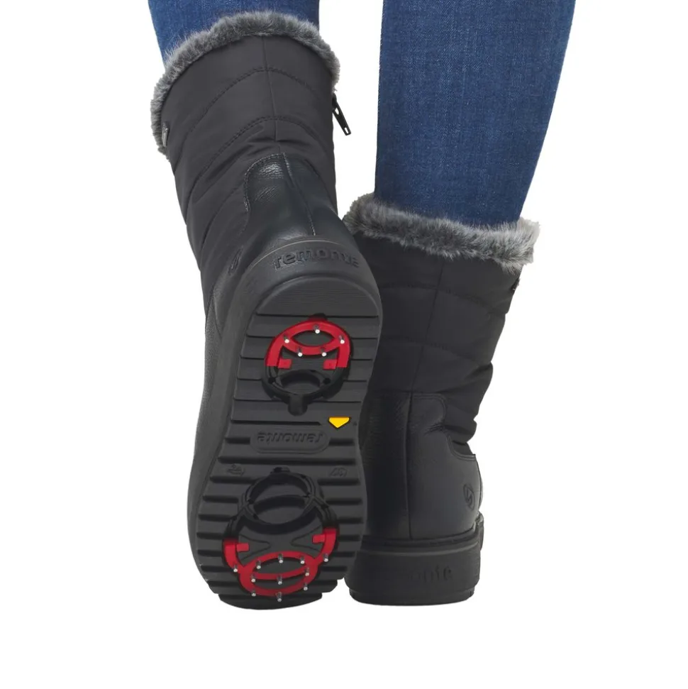 Remonte vinterstøvle til dame i sort. Mere bevægelsesfrihed til dine fødder! Disse Remonte kortstøvler til damer sikrer, at du står fast, selv på glatte overflader. Lynlåsen gør dem nemme at tage på, mens den fleksible og grebssikre sål giver dig et solidt fodfæste. Komfortbredden G giver ekstra plads til dine fødder, så du kan nyde en behagelig pasform hele dagen. Funktionaliteten er i top med den vandafvisende RemonteTex-membran og de udklappelige pigge, der sikrer ekstra greb på isede underlag. Den varme udtagelige indersål beskytter mod kulde, og det bløde uldfoer gør støvlerne ideelle til de kolde temperaturer. Disse vinterstøvler er den perfekte kombination af coolness og praktisk funktion!