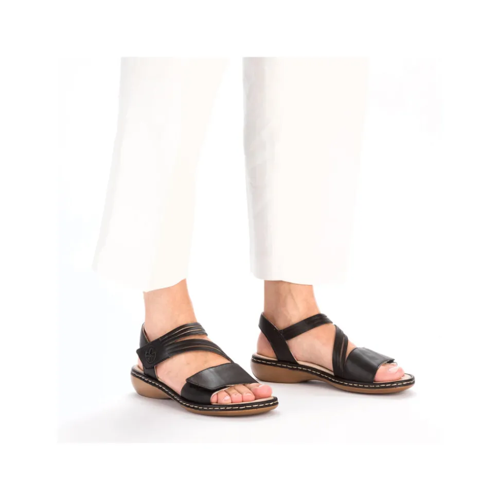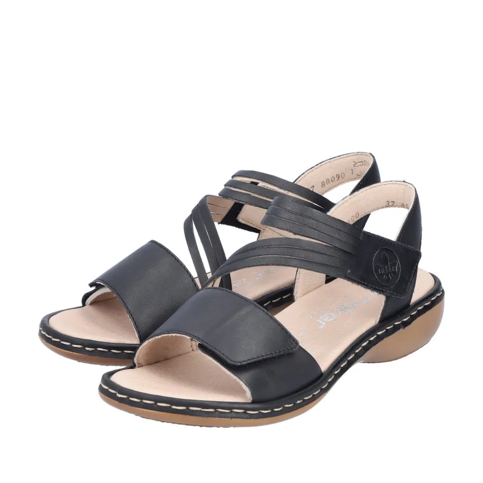 Rieker sandal til dame i sort. Denne stilrene sandal fra Rieker er det ideelle valg til at opgradere din garderobe med et par praktiske og flotte kvalitetssandaler. Med en blød lædersål og lette, fleksible materialer giver den maksimal komfort og støtte til dine fødder. Sandalen er udstyret med to velcro-lukninger, så du nemt kan tilpasse den til din individuelle pasform. Med en Antistress-stødabsorberende sål er dette en sko, som du kan have på hele dagen uden ubehag. Fremstillet af de blødeste kvalitetsmaterialer er du sikret den mest optimale pasform.
