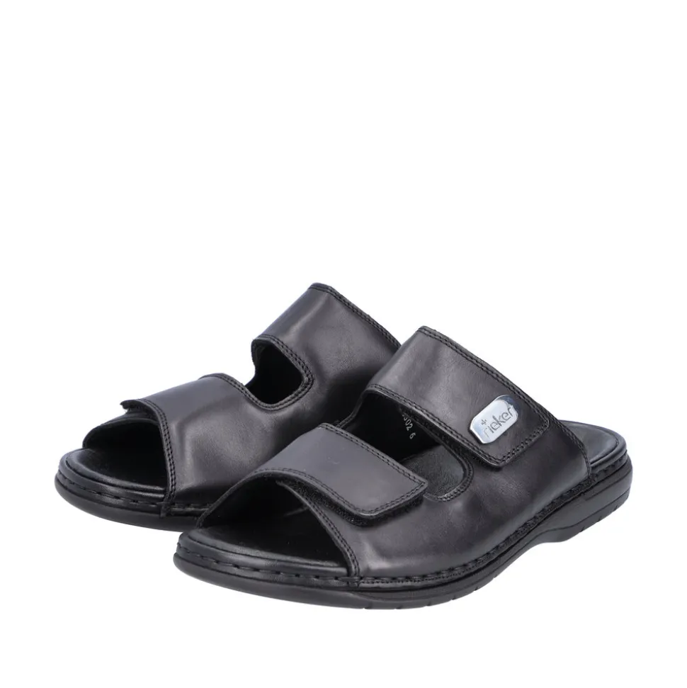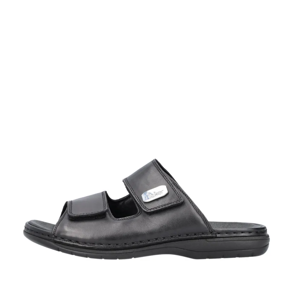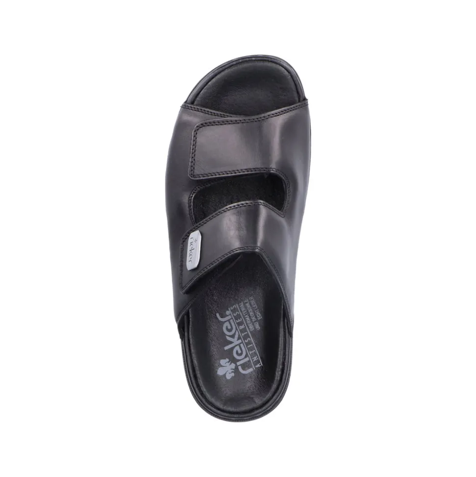 Rieker slenters til herre i sort. Disse Rieker herresandaler i blank sort glat læder får dine fødder til at føle sommeren på den helt rigtige måde. Med en velcrolukning lukkes de på ingen tid. Den åbne sandal og den lette, støddæmpende sål sikrer vedvarende komfort. Derudover er indersålen ekstra blød. Modellen giver ekstra bevægelsesfrihed til foden, da den er designet i komfortabel bredde G. Sandalen er foret med let, åndbart materiale, der absorberer fugt og holder fødderne friske. Dine bedste venner til den nye sæson!