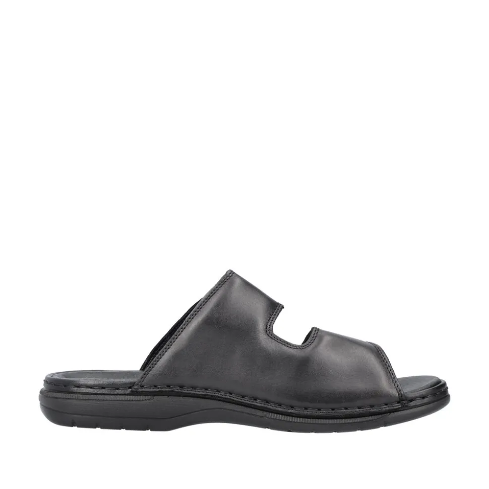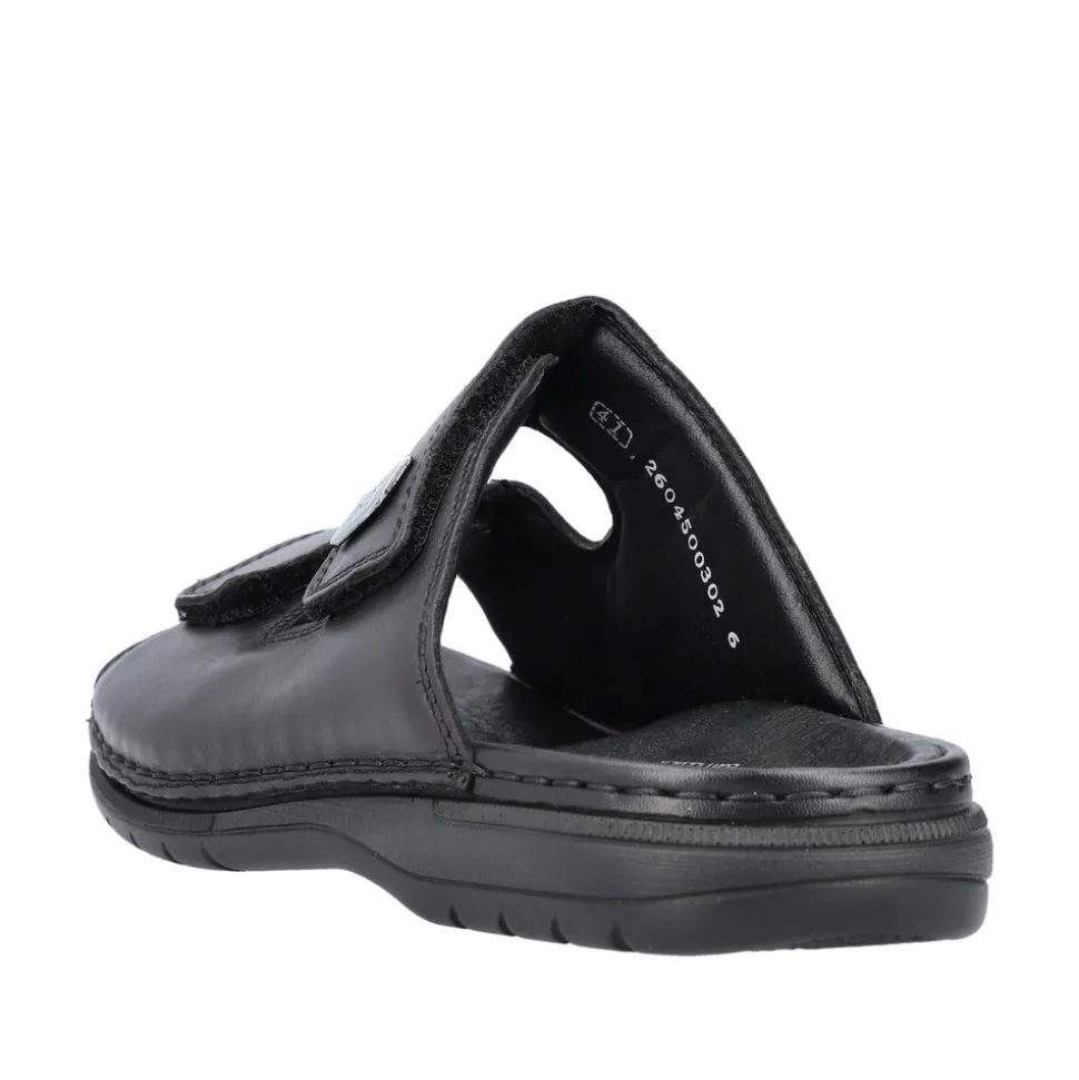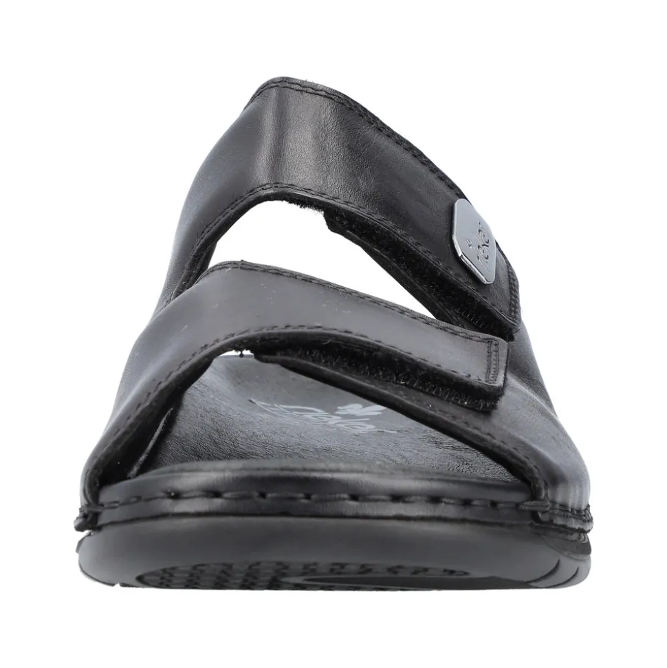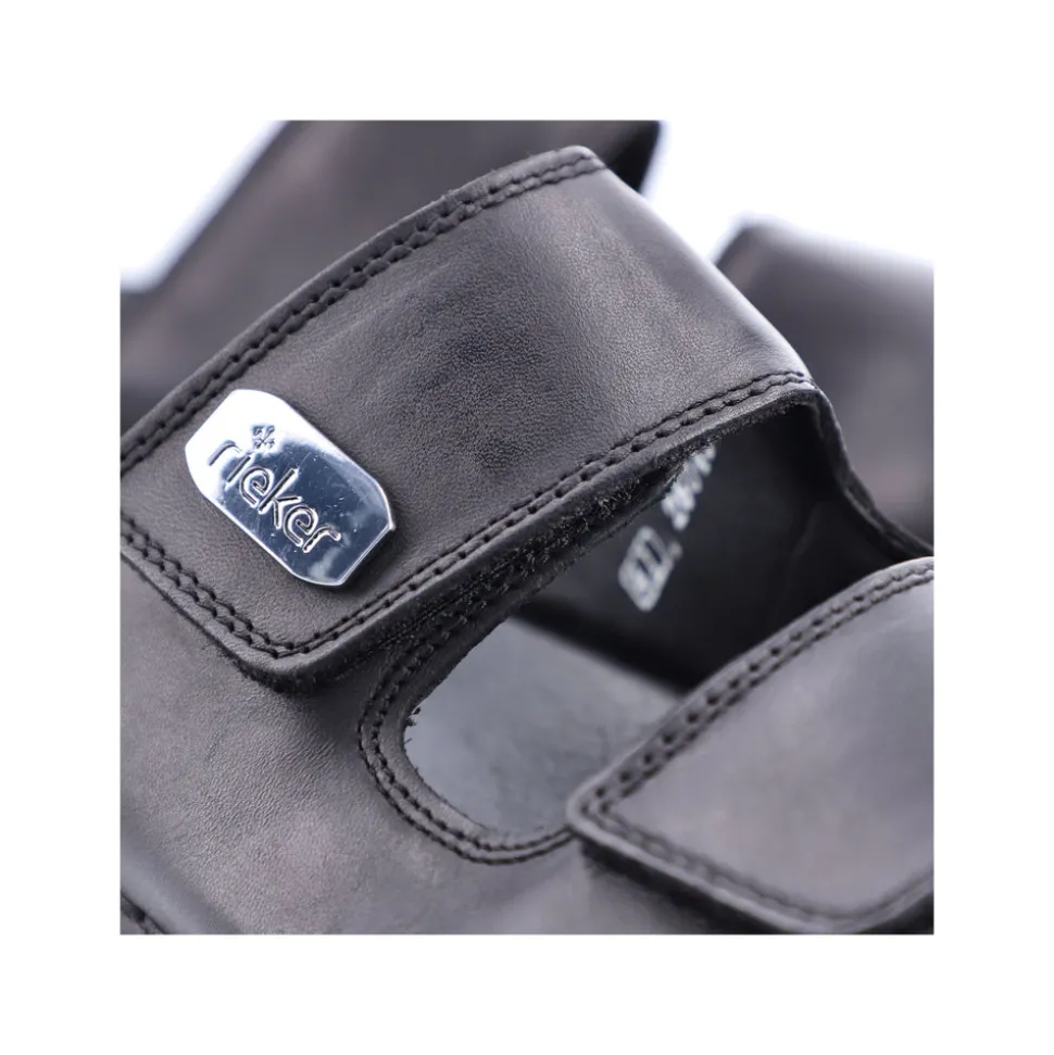 Rieker slenters til herre i sort. Disse Rieker herresandaler i blank sort glat læder får dine fødder til at føle sommeren på den helt rigtige måde. Med en velcrolukning lukkes de på ingen tid. Den åbne sandal og den lette, støddæmpende sål sikrer vedvarende komfort. Derudover er indersålen ekstra blød. Modellen giver ekstra bevægelsesfrihed til foden, da den er designet i komfortabel bredde G. Sandalen er foret med let, åndbart materiale, der absorberer fugt og holder fødderne friske. Dine bedste venner til den nye sæson!