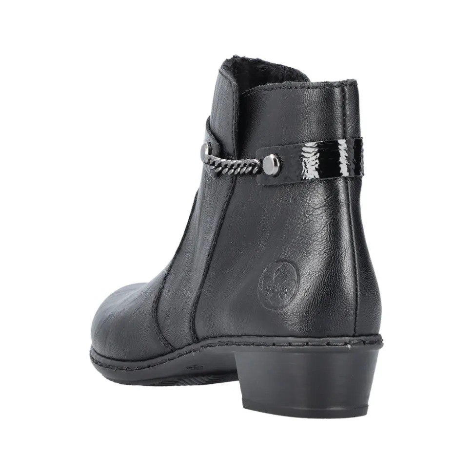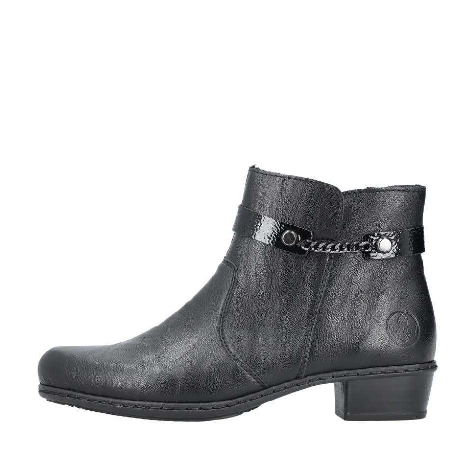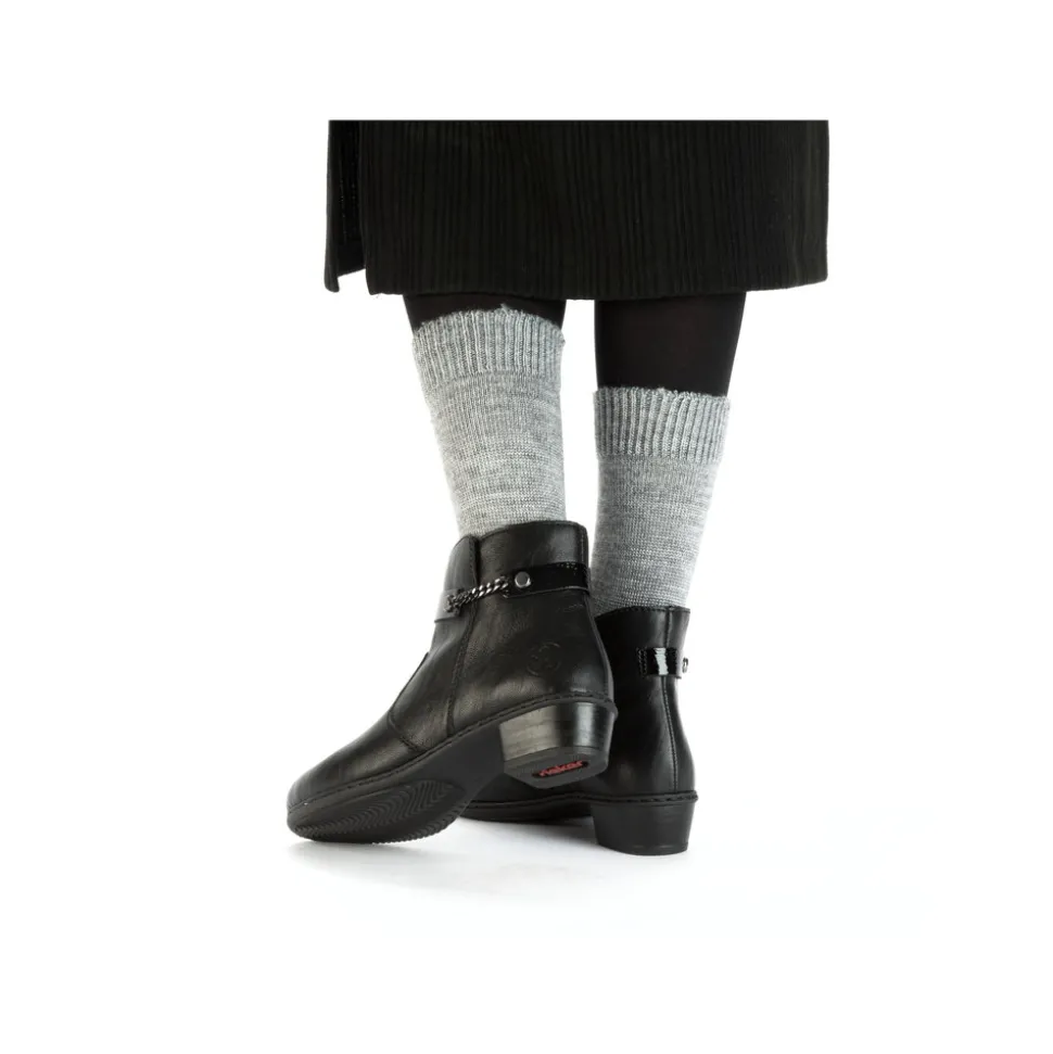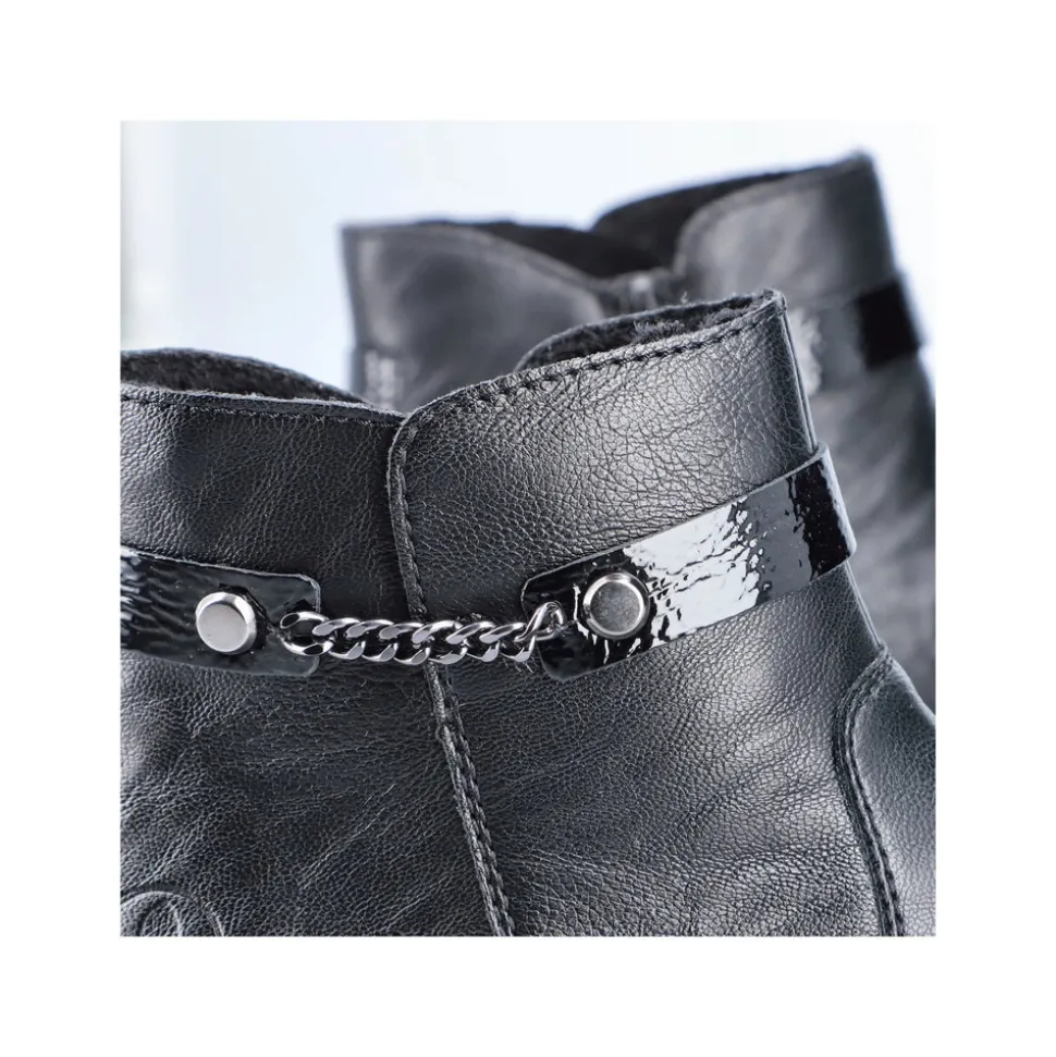Rieker støvle i sort til dame. Disse støvletter er den perfekte kombination af komfort og stil. Med lynlåsen kan du nemt og hurtigt tage dem på, mens den dekorative sølvkæde på siden tilføjer et moderne touch. Den lette og støddæmpende sål med ca. 3 cm. blokhæl sikrer uovertruffen komfort, selv på de længste dage. Oplev en moderne wellness-oplevelse i ægte Rieker-stil! Denne elegante letvægtsstøvle i en sofistikeret sort nuance er prydet med smukke detaljer på siden. Med blød, fleksibel konstruktion og let foring, tilbyder den ekstra komfort til dine fødder hele dagen.