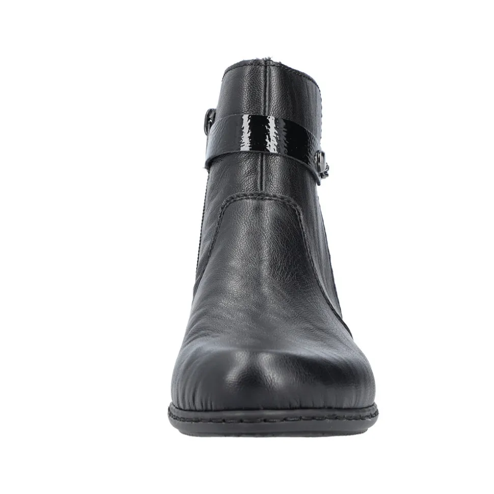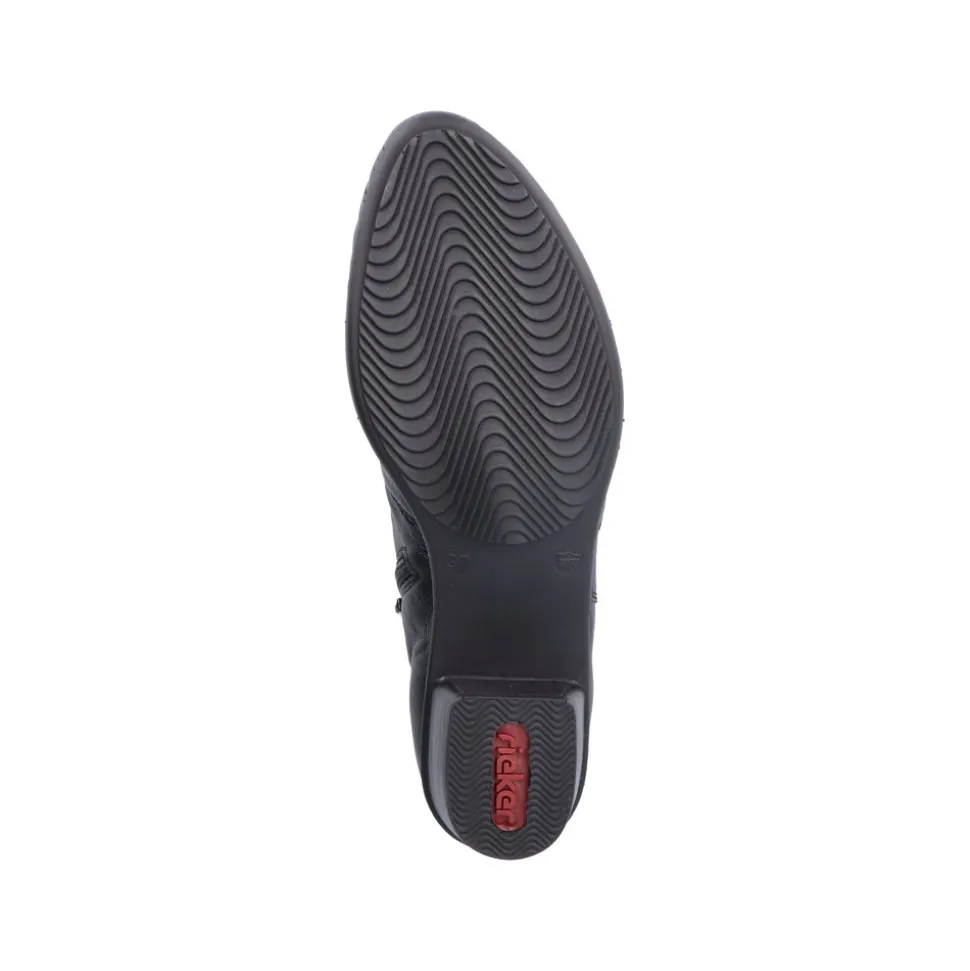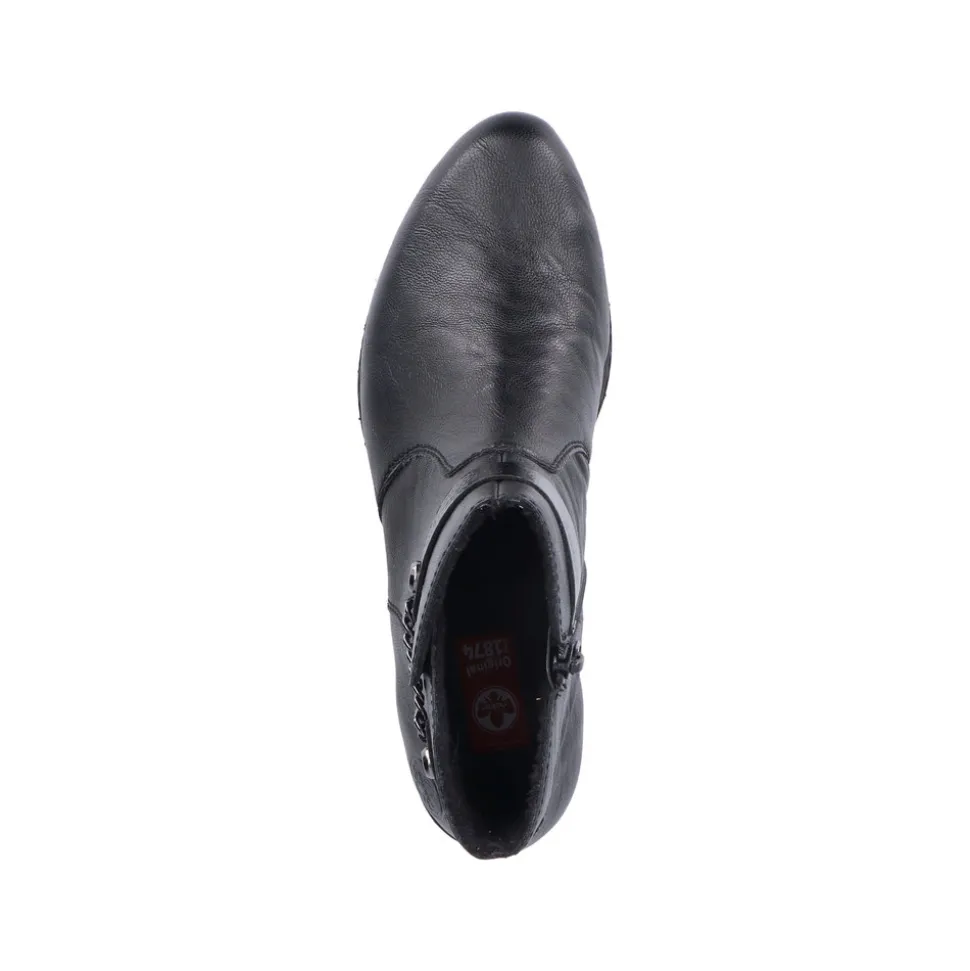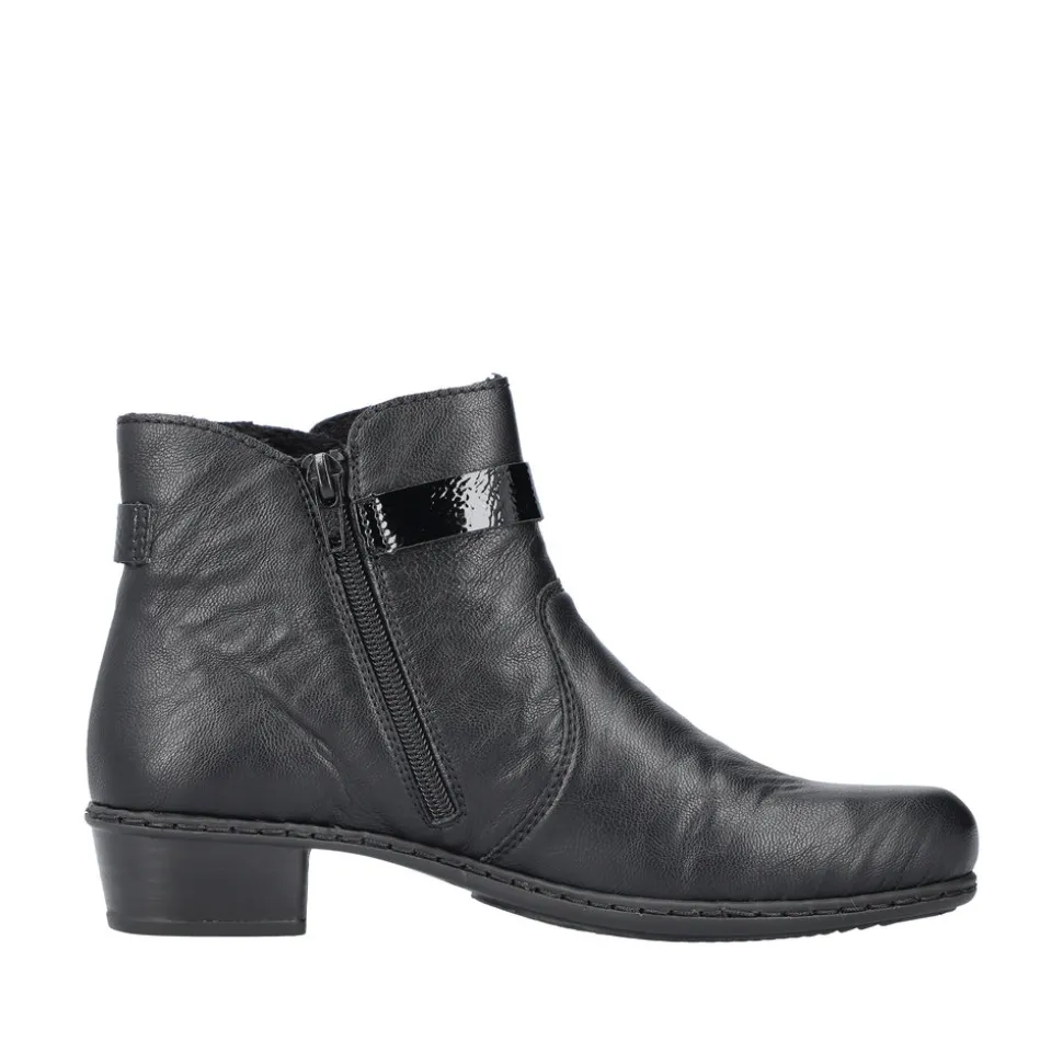 Rieker støvle i sort til dame. Disse støvletter er den perfekte kombination af komfort og stil. Med lynlåsen kan du nemt og hurtigt tage dem på, mens den dekorative sølvkæde på siden tilføjer et moderne touch. Den lette og støddæmpende sål med ca. 3 cm. blokhæl sikrer uovertruffen komfort, selv på de længste dage. Oplev en moderne wellness-oplevelse i ægte Rieker-stil! Denne elegante letvægtsstøvle i en sofistikeret sort nuance er prydet med smukke detaljer på siden. Med blød, fleksibel konstruktion og let foring, tilbyder den ekstra komfort til dine fødder hele dagen.