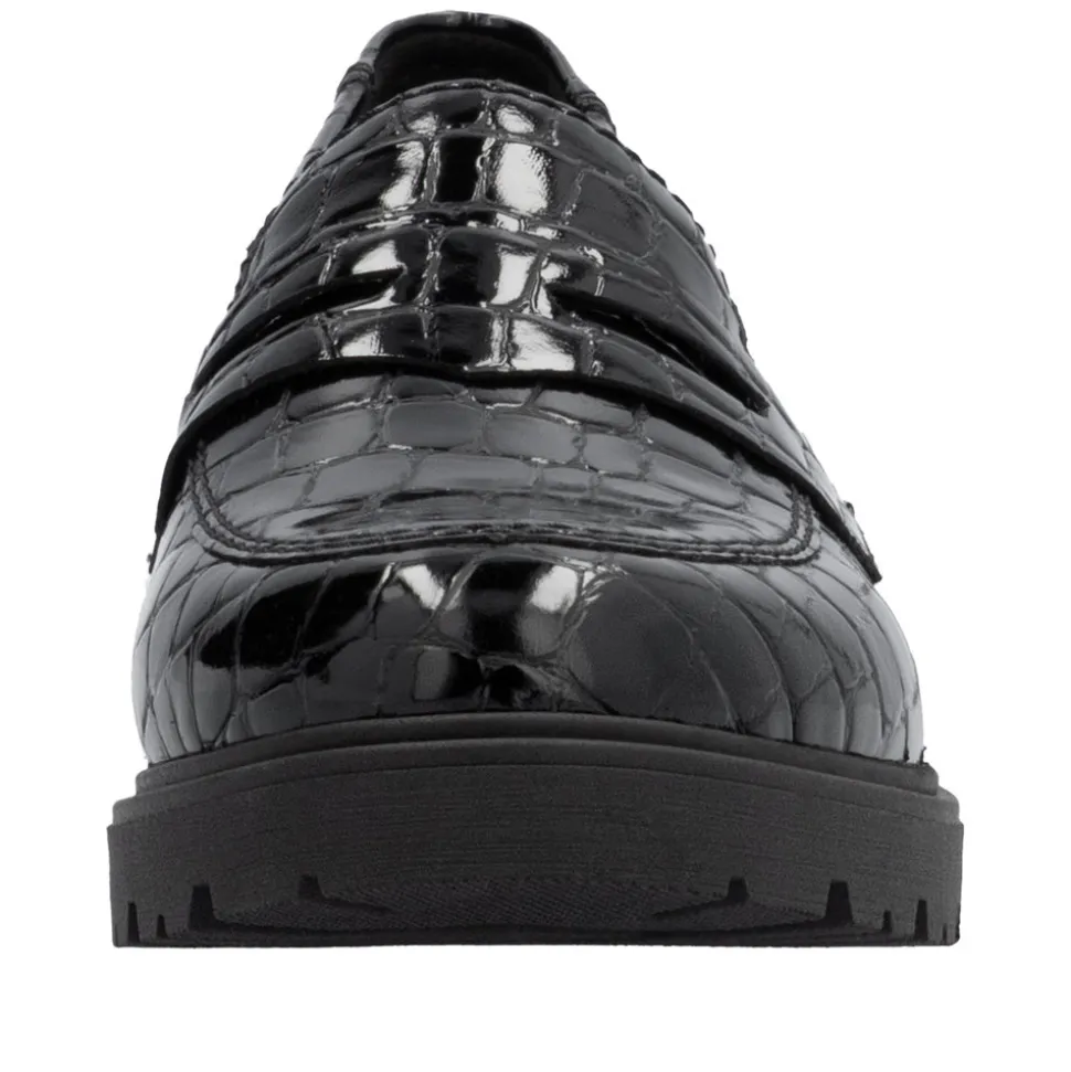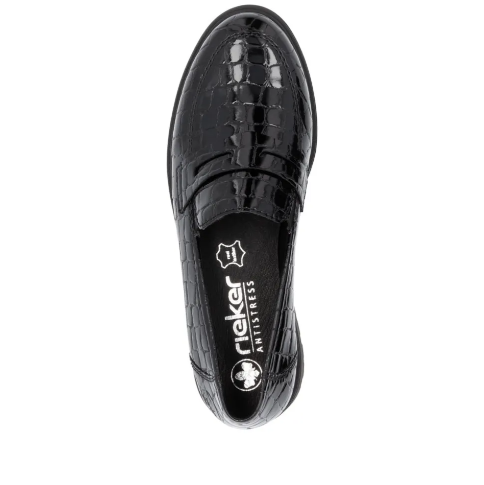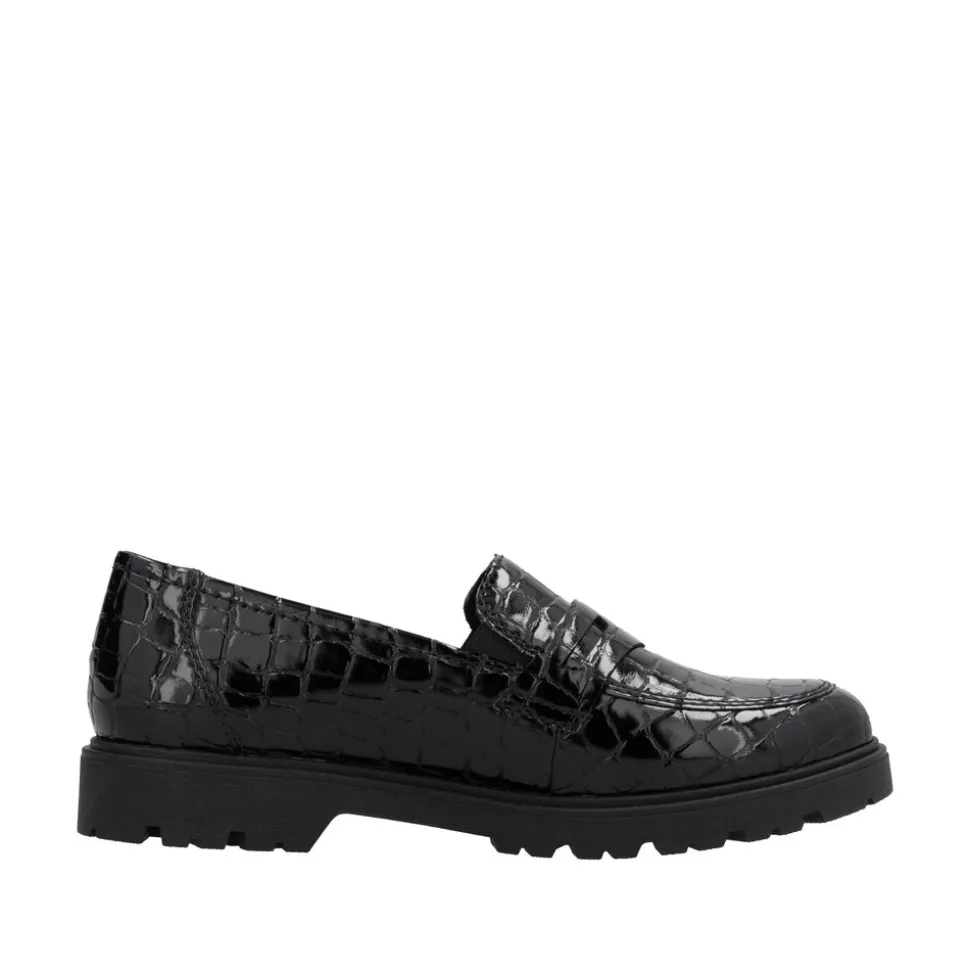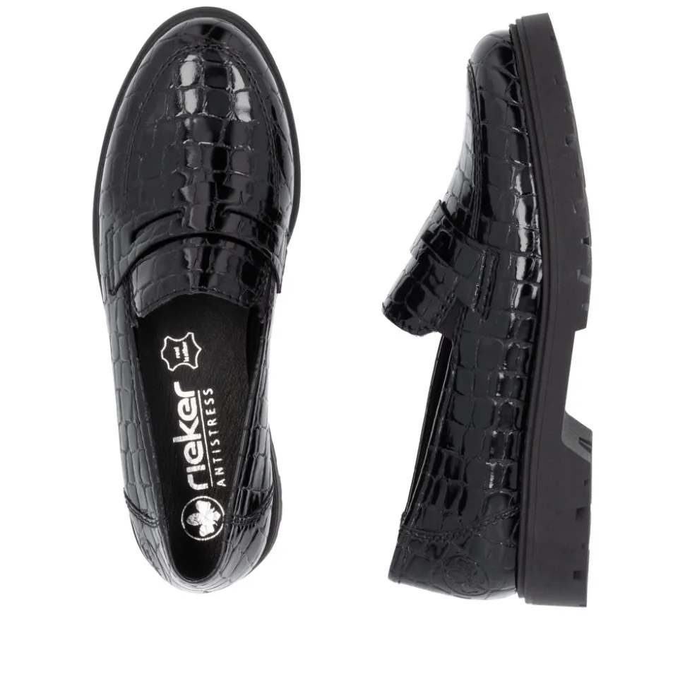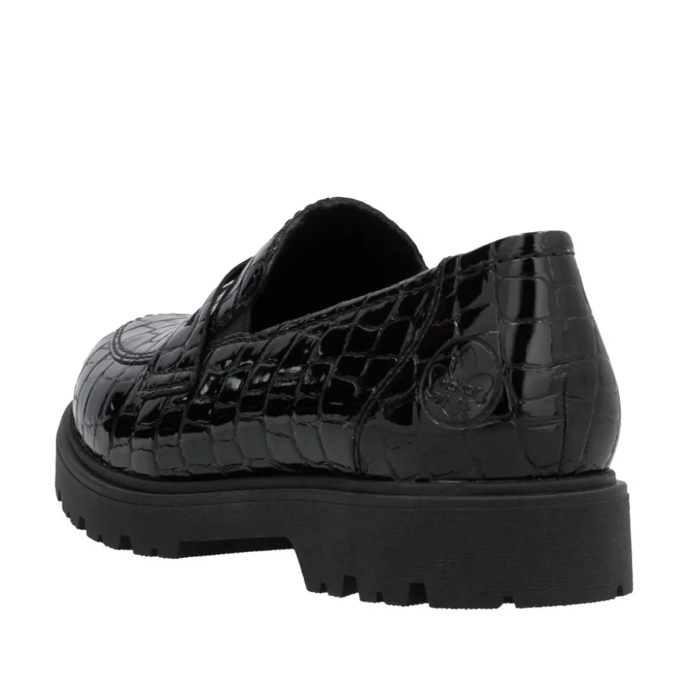Rieker loafers til dame i sort. Komfort og godt udseende – det kan lade sig gøre! Disse Rieker loafers til damer i kunstlak er den perfekte komfortable følgesvend. Skoene kan nemt tages på uden lukning ved blot at smutte i dem. De har en let, stødabsorberende og grebsstærk sål, der sikrer et sikkert skridt. Derudover har de en ekstra blød indersål i ægte læder, som giver maksimal komfort. Forkæl dine fødder med disse loafers til damer Rieker!