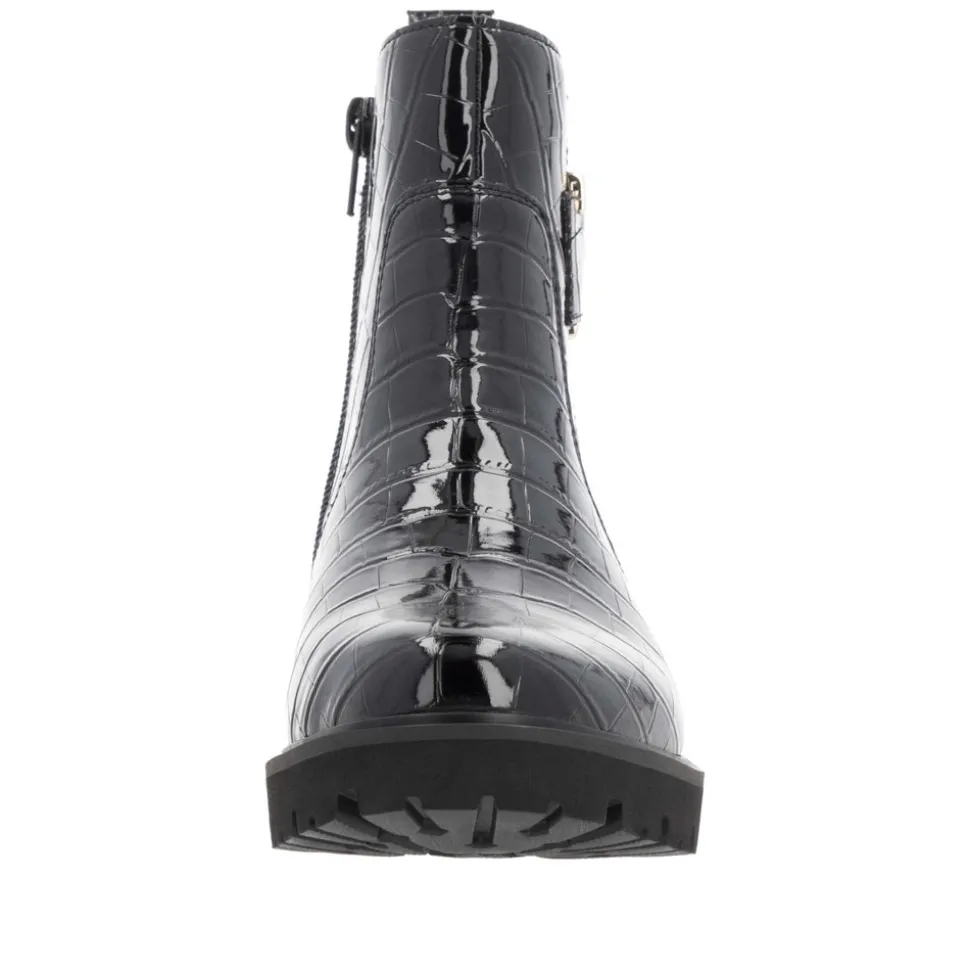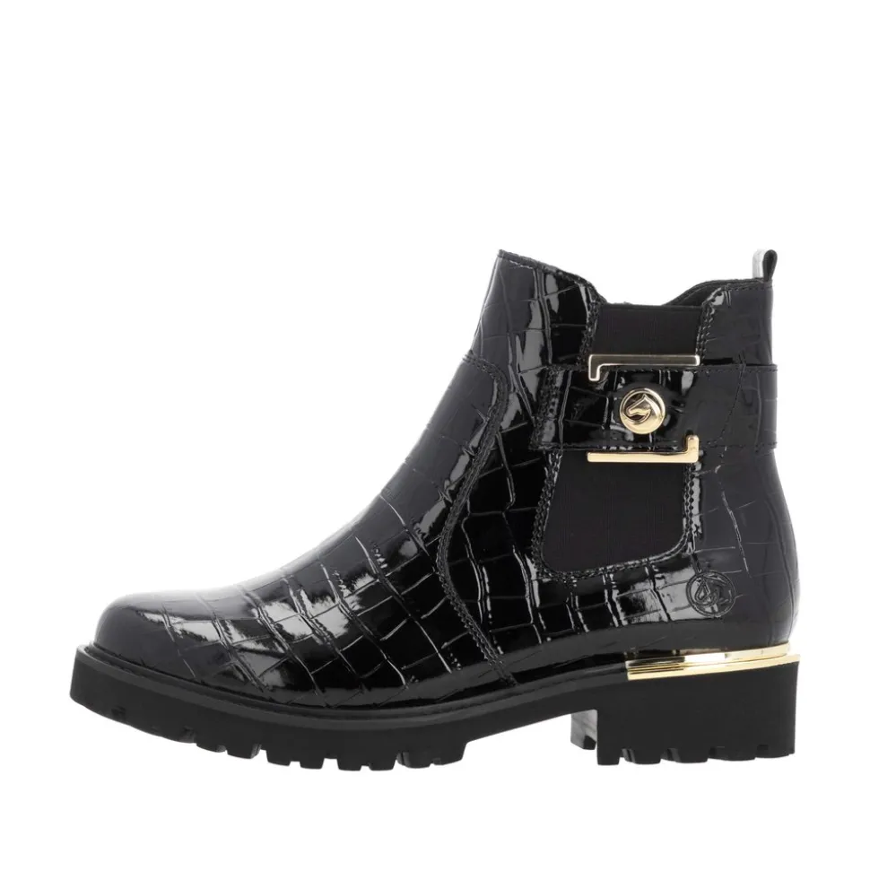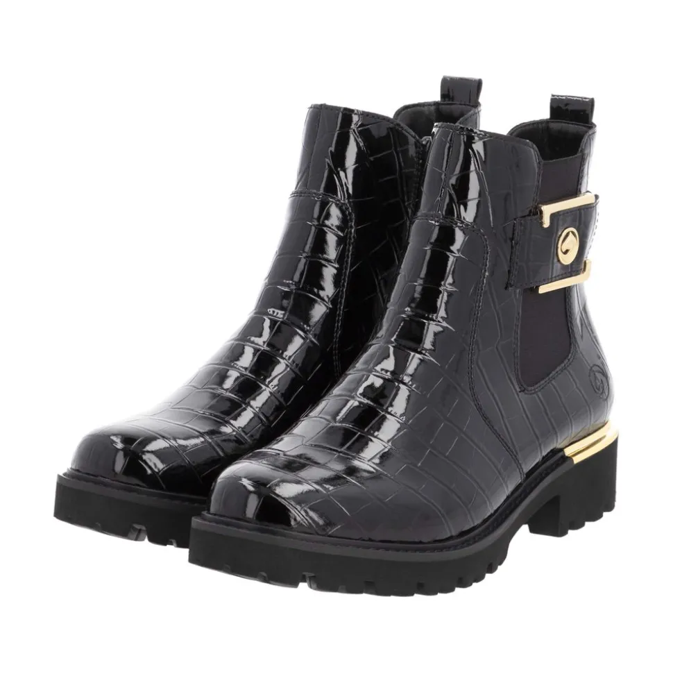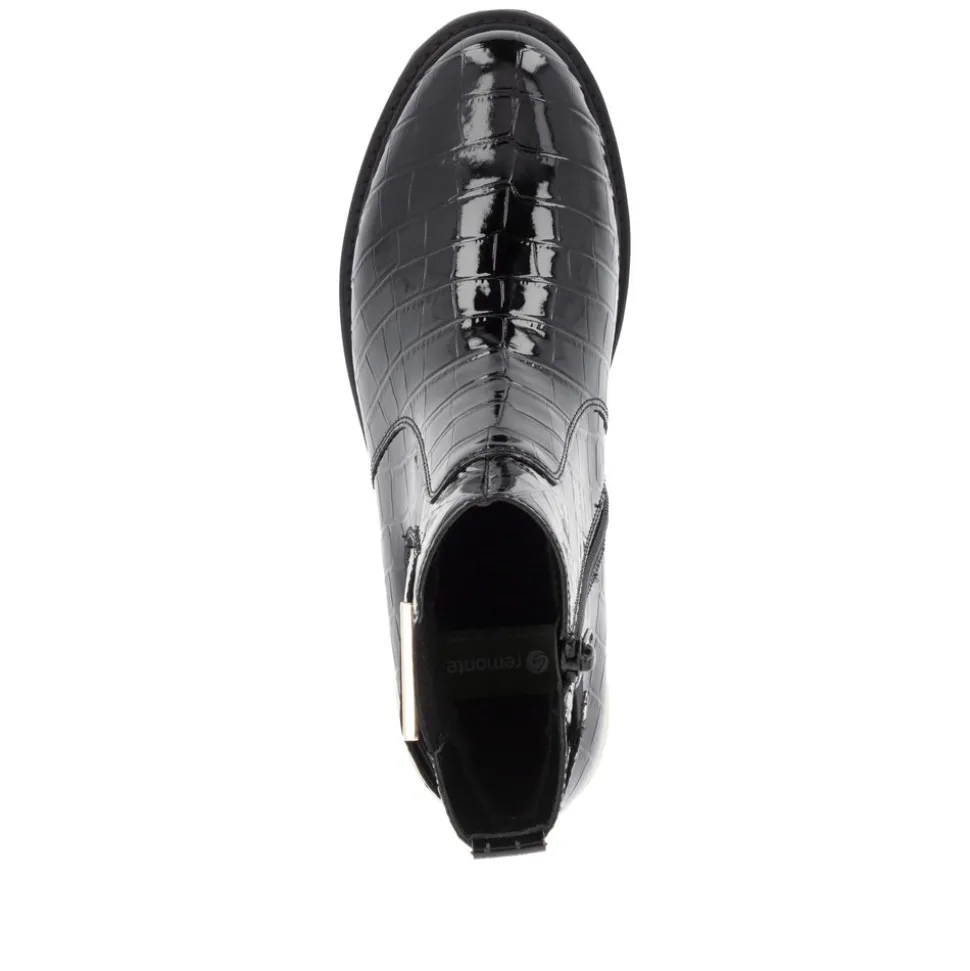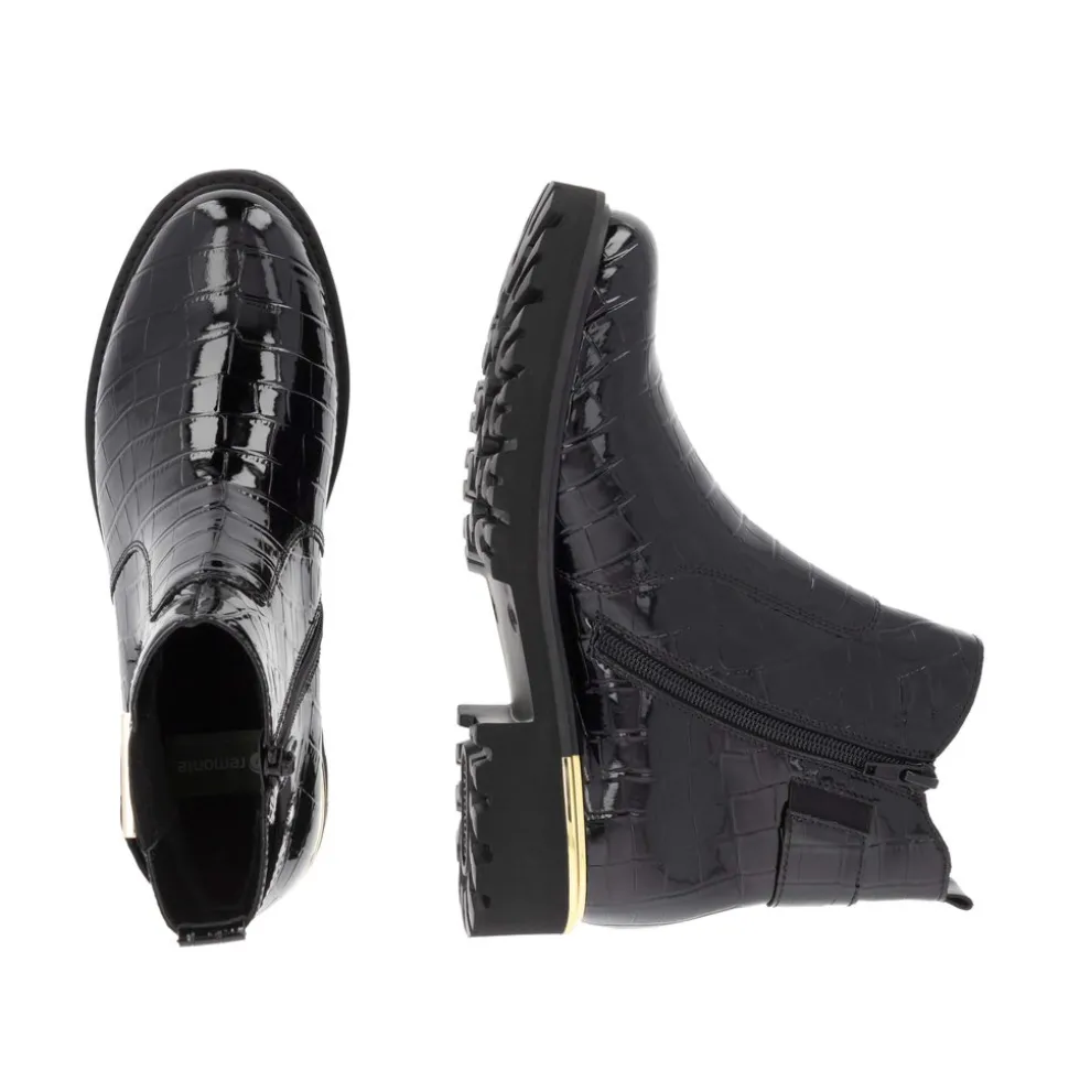 Remonte støvle til dame i sort. En super moderne støvle, der kombinerer en stilfuld sort farve med krokodillemønster og et lak look for at give et ekstra elegant udtryk. Støvlen er udsmykket med flotte gulddetaljer på siden og bag hælen. Støvlen har en let foring indvendigt, så støvlen kan bruges hele året rundt. Den praktiske lynlås på indersiden og elastikken på ydersiden gør det let at tage støvlen af og på. Støvlens chunky sål har et godt mønster, som forbedrer skridsikkerheden, og den har også en udtagelig sål.