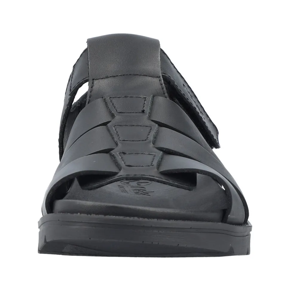 Rieker sandal til herre i sort. Disse Rieker sandaler til herrer i sort glat læder får dig helt sikkert i feriestemning og har både komfort, funktion og selvfølgelig stil. Takket være remmene og velcrolukningen tilpasser modellen sig individuelt til foden. Den brede hælstrop giver ekstra støtte. Med den meget lette og støddæmpende sål forkæles dine fødder ved hvert skridt. En ekstra komfortfaktor er den brede komfortstørrelse G 1/2, som giver mere plads i sandalen. Det særligt åndbare og fugtabsorberende foer er ideelt til varme temperaturer.