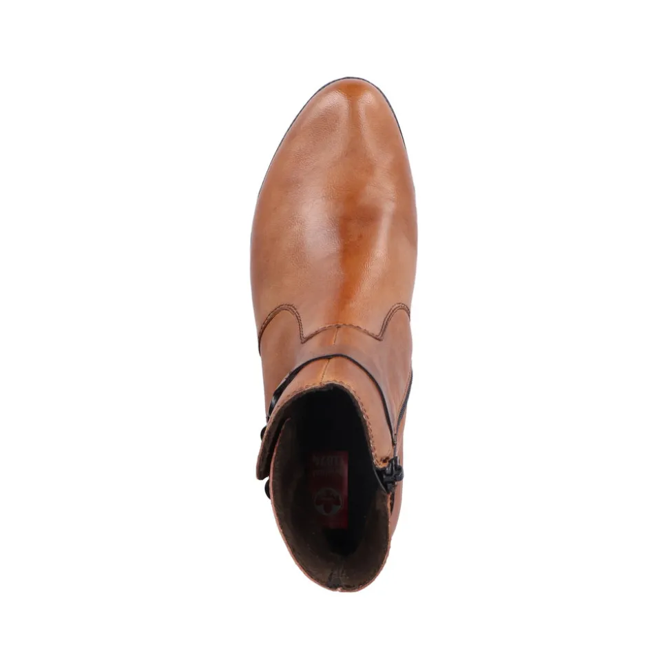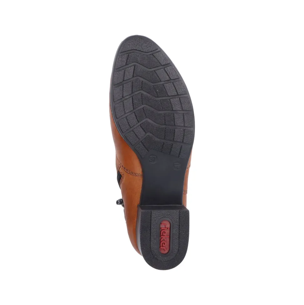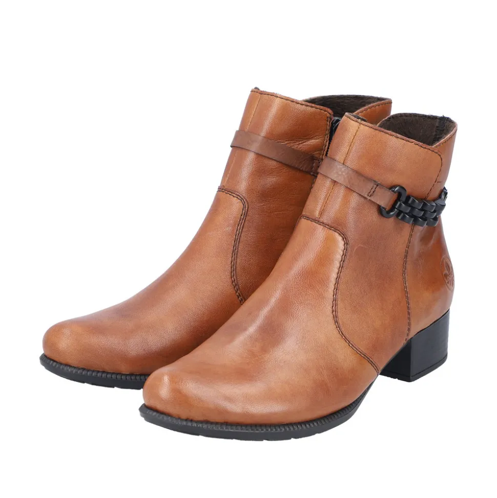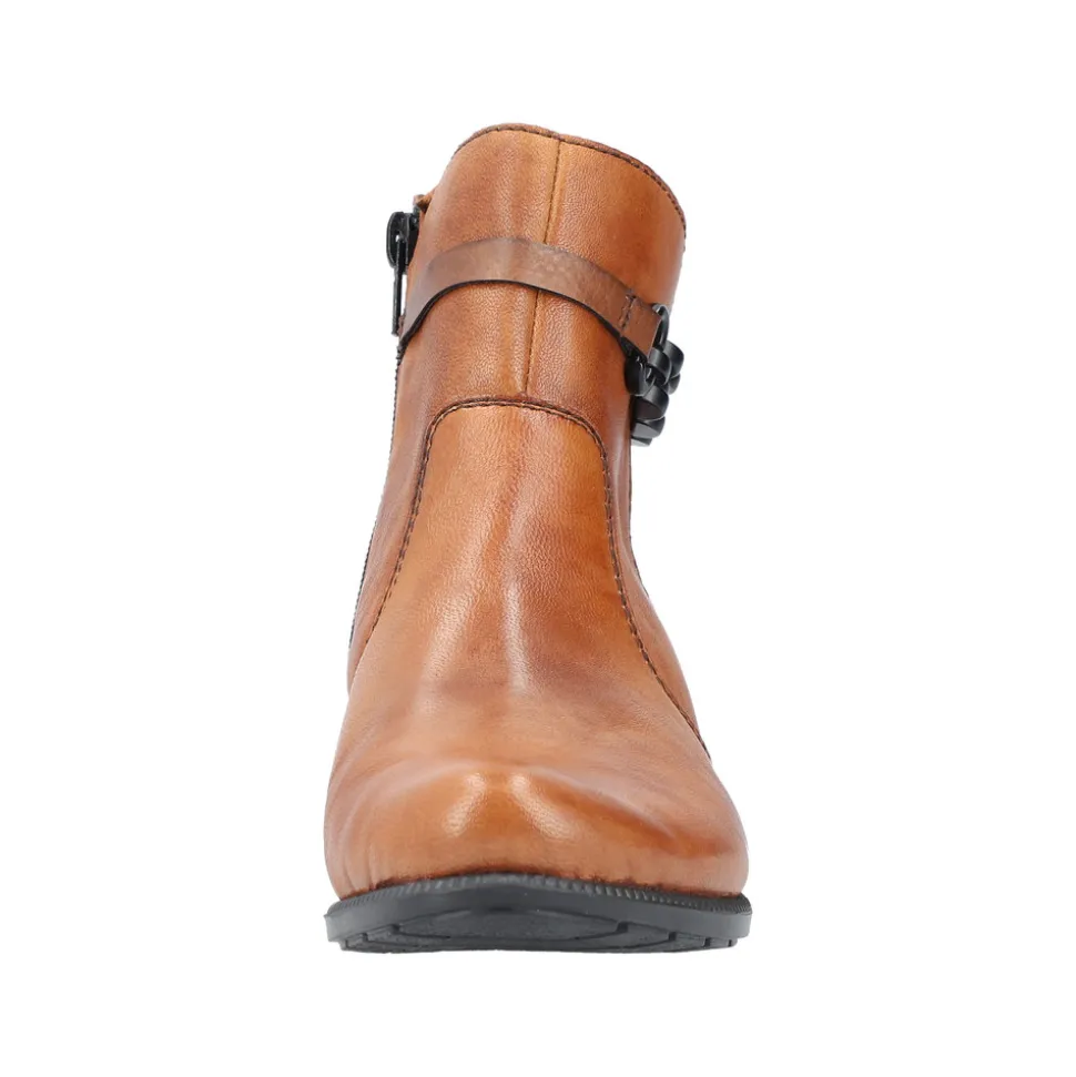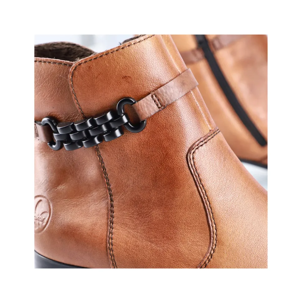 Rieker støvle til dame i en flot brun farve. Lækker støvle med en overdel i ægte læder og 5 cm hæl samt lynlås i siden som gør modellen nemmere at tage af af på. En klassisk Rieker støvle der er let foret med en flot kæde detalje på siden af støvlen. En let støvle med stødabsorberende bund samt fleksibel bøjelig model.
