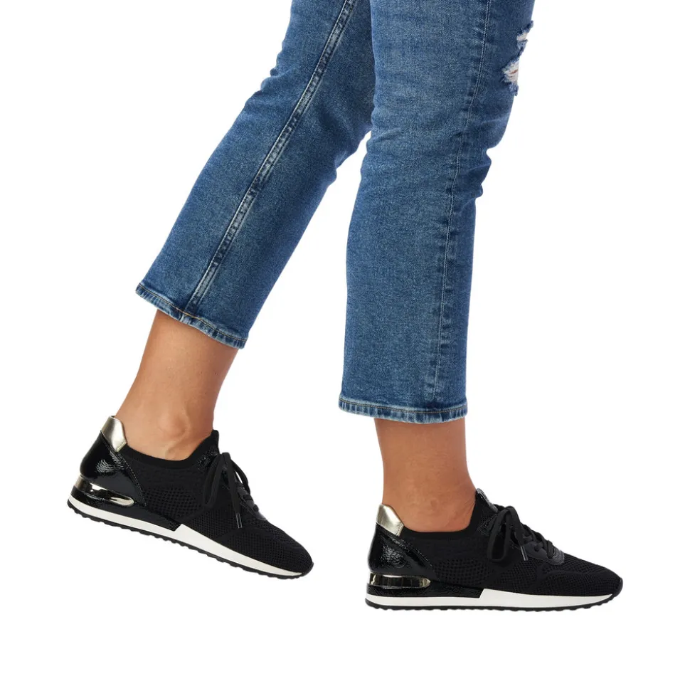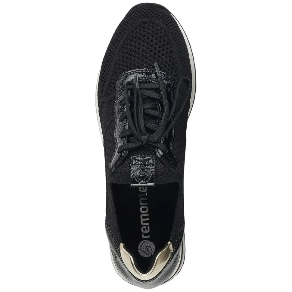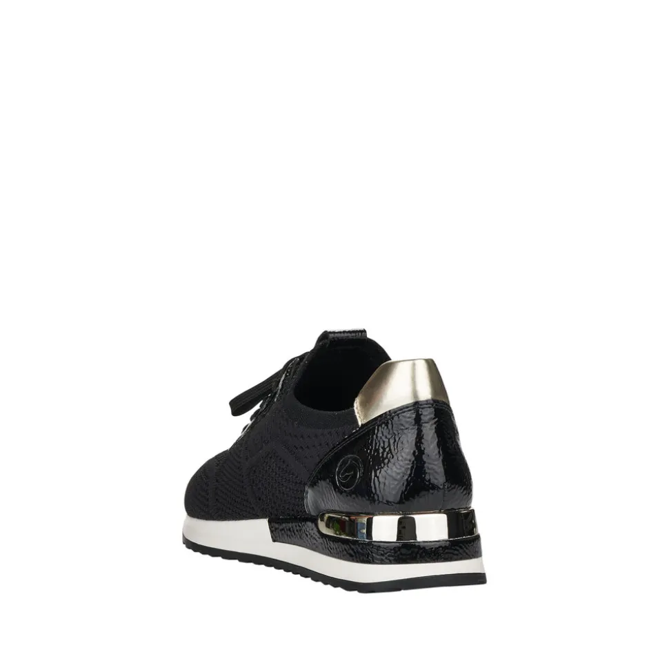 R2538-01 Remonte Sneakers i Sort til Dame. Super fin og let sneakers fra Remonte, i en fin sort farve med flotte guld detaljer. Modellen har udtagelige såler, samt snøre så den er nem at komme i/af. Remonte skoen er lavet af et elastisk materiale.