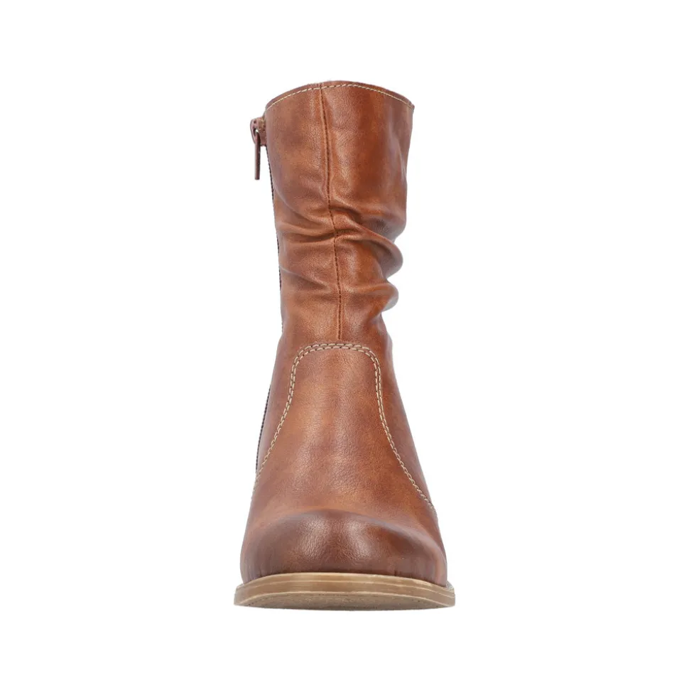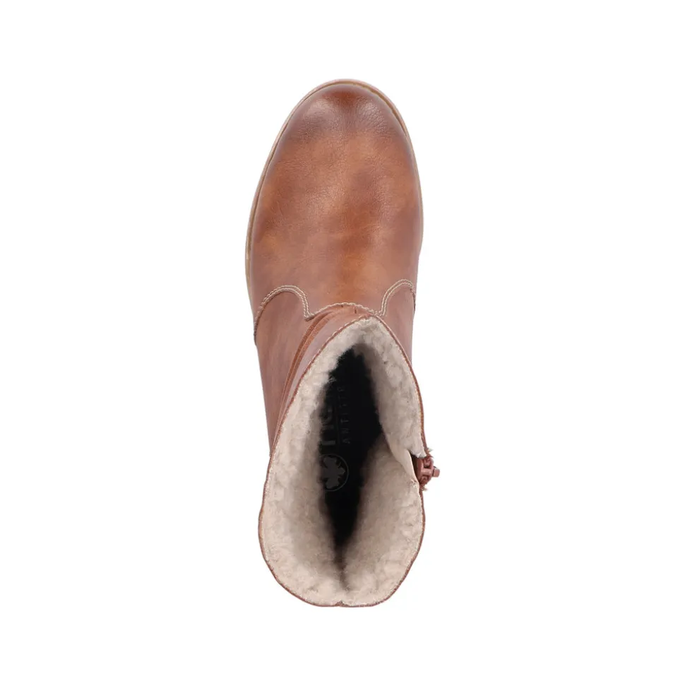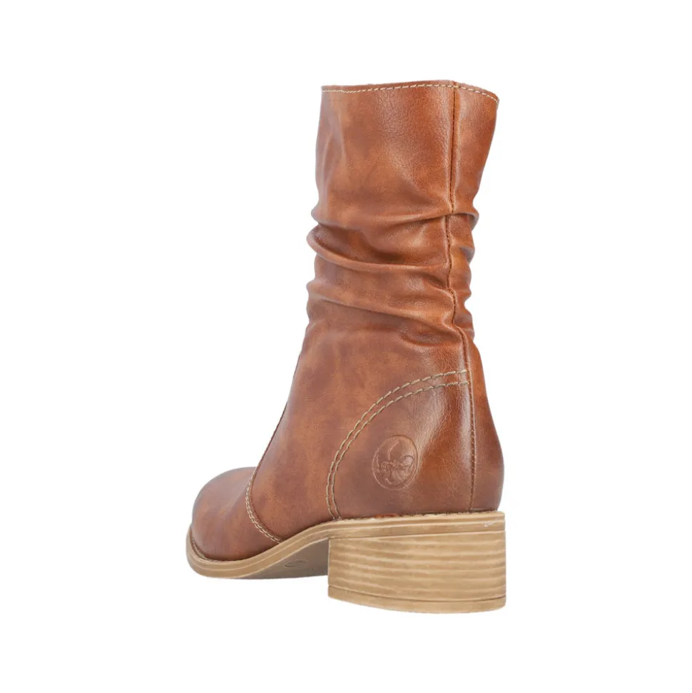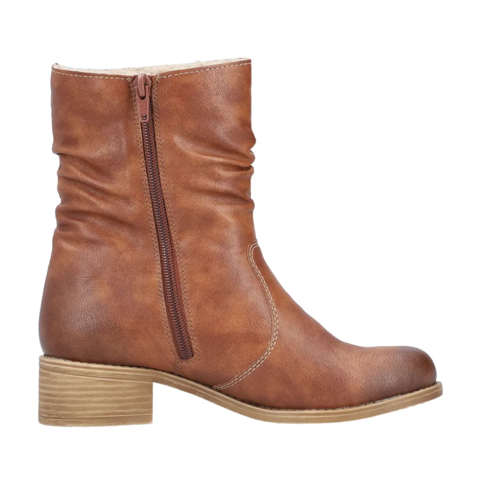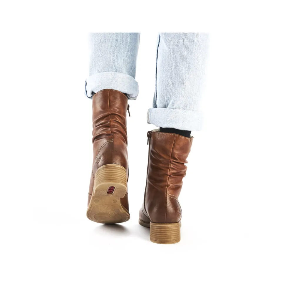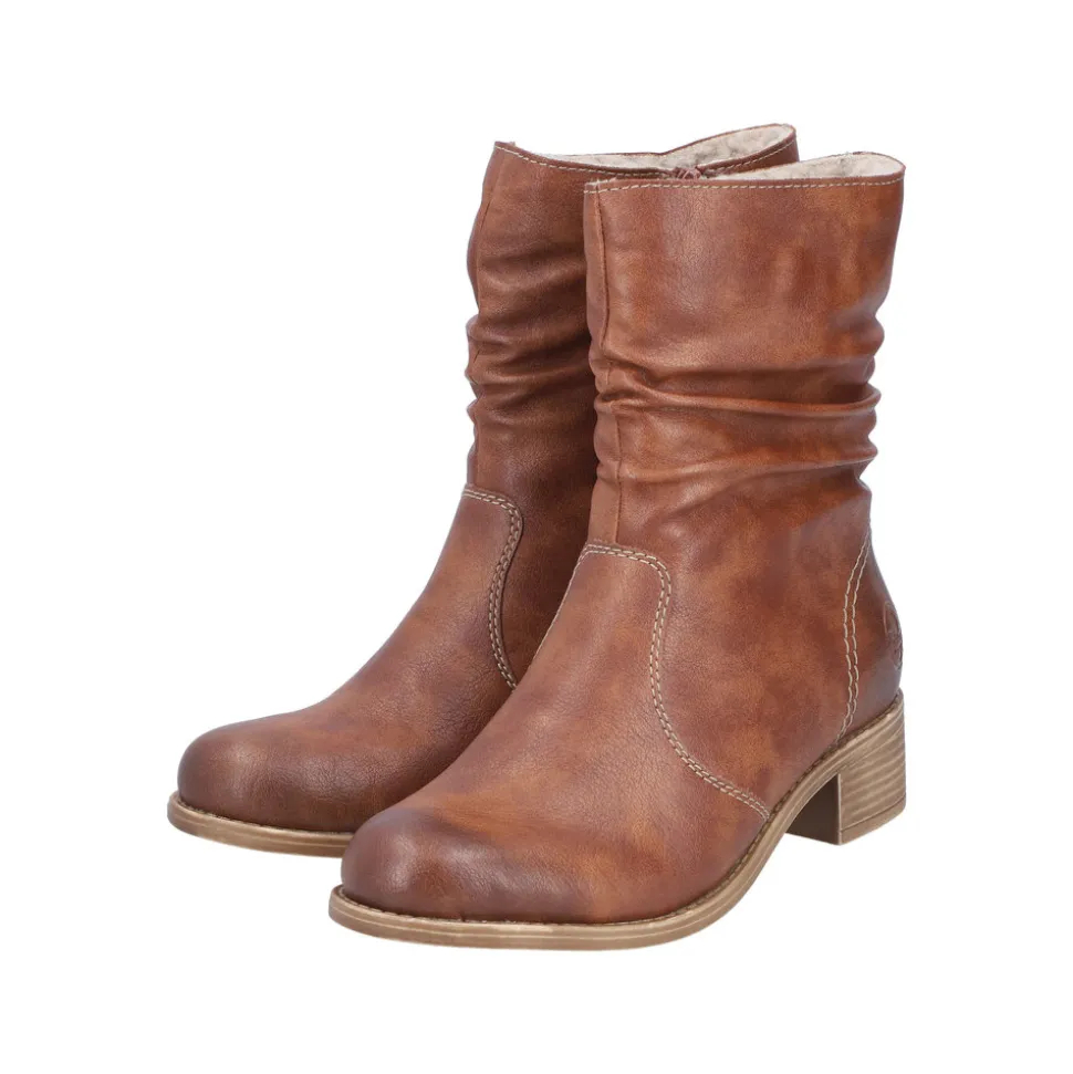 Rieker støvle til dame i brun. Gør dig klar til at møde vinteren med stil! Disse nougatbrune Rieker ankelstøvler til kvinder er designet til at holde kulden ude med den varme foring, så du kan gå komfortabelt hele dagen. Med en smart lynlås bliver de nemme at tage af og på, og den trendy, rynkede overflade tilføjer et strejf af elegance til dit look. Den robuste sål med 4 cm. blokhæl sikrer et stabilt og skridsikkert skridt, mens den ekstra bløde indersål giver en følelse af luksus ved hvert trin. Det varme foer beskytter effektivt mod kulden, hvilket gør disse støvler til dine bedste venner i den nye sæson.