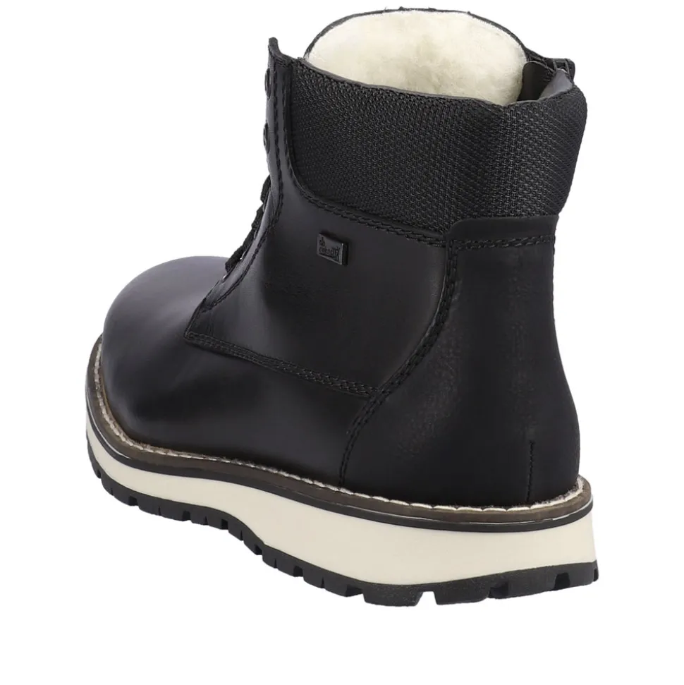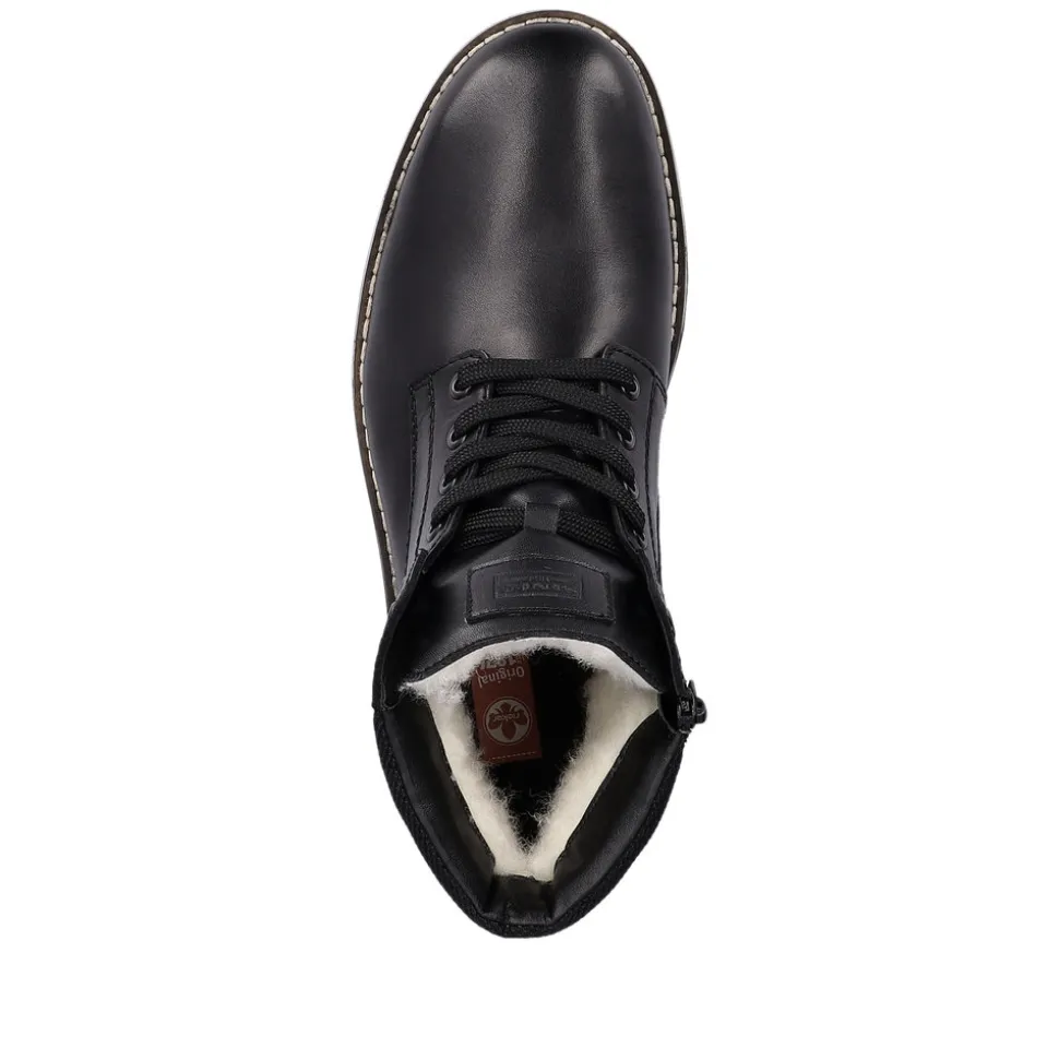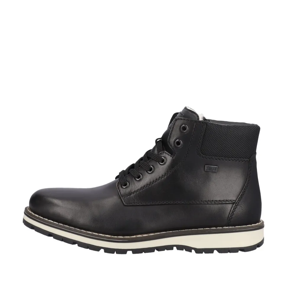 Rieker støvle i sort til herre. Denne herrestøvle er skabt til vinterens kulde og er udstyret med et 100% naturligt, varmt uldfoer samt RiekerTex, der gør støvlen vandafvisende. Du får en varm støvle med en autentisk læderoverdel, en stødabsorberende sål og ekstra plads i støvlen for øget komfort. Støvlen har en praktisk lynlås på siden, der gør den nem at tage på og af, samt snørebånd, så du kan tilpasse pasformen til din fod.