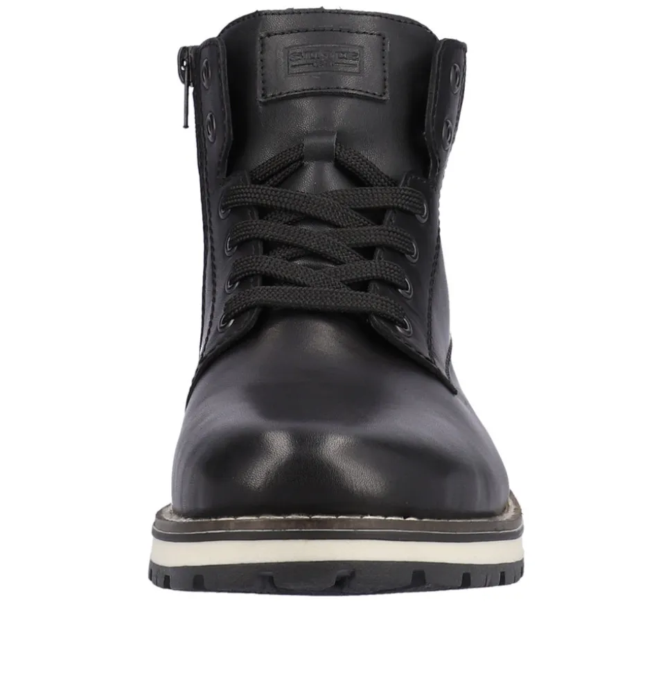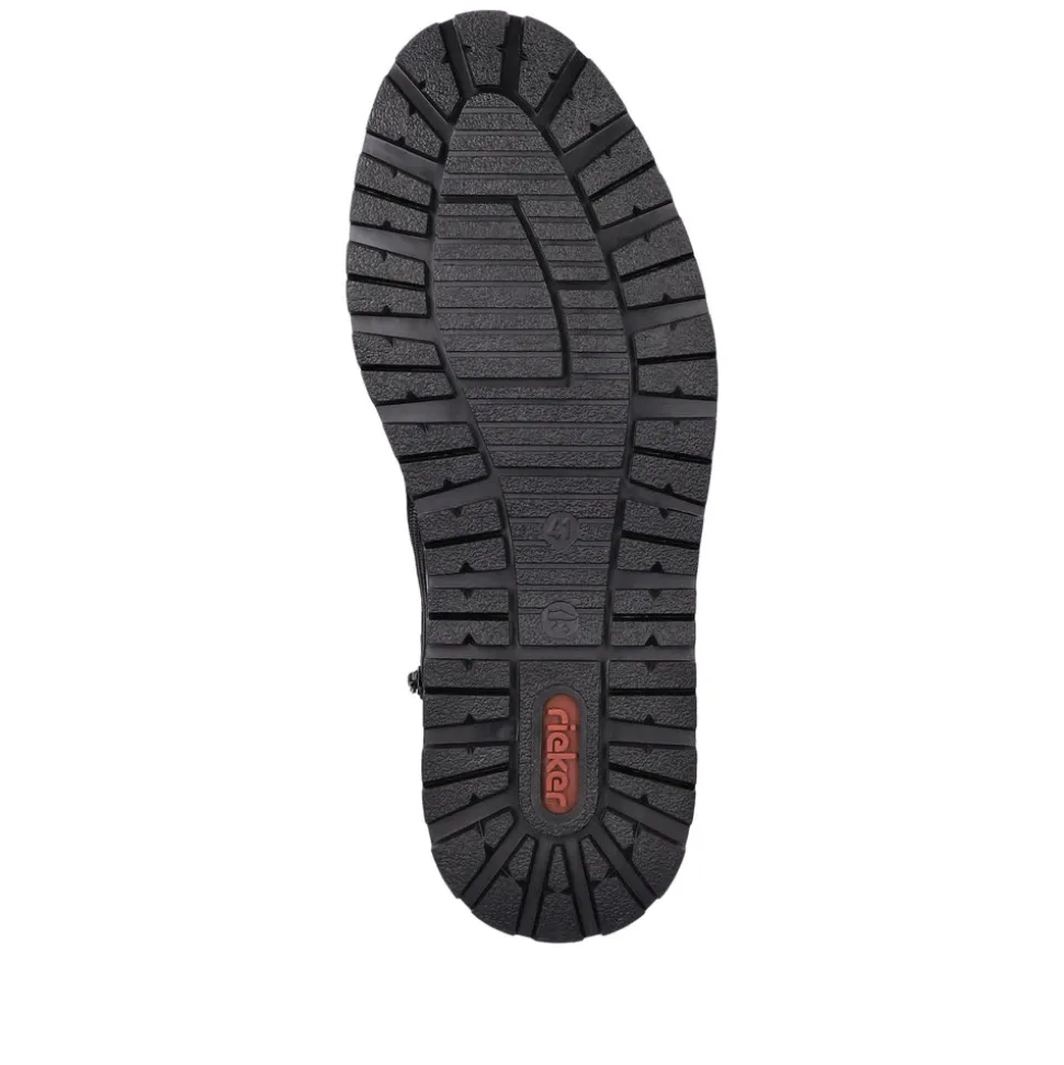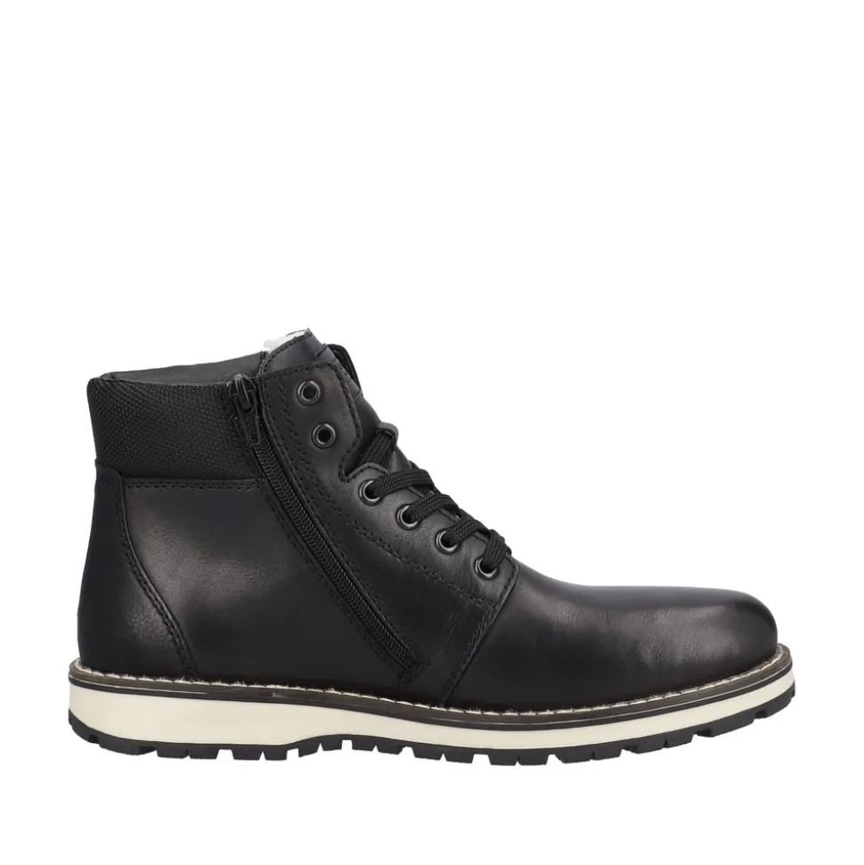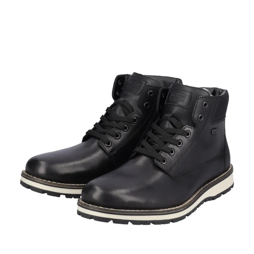 Rieker støvle i sort til herre. Denne herrestøvle er skabt til vinterens kulde og er udstyret med et 100% naturligt, varmt uldfoer samt RiekerTex, der gør støvlen vandafvisende. Du får en varm støvle med en autentisk læderoverdel, en stødabsorberende sål og ekstra plads i støvlen for øget komfort. Støvlen har en praktisk lynlås på siden, der gør den nem at tage på og af, samt snørebånd, så du kan tilpasse pasformen til din fod.